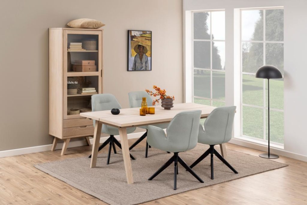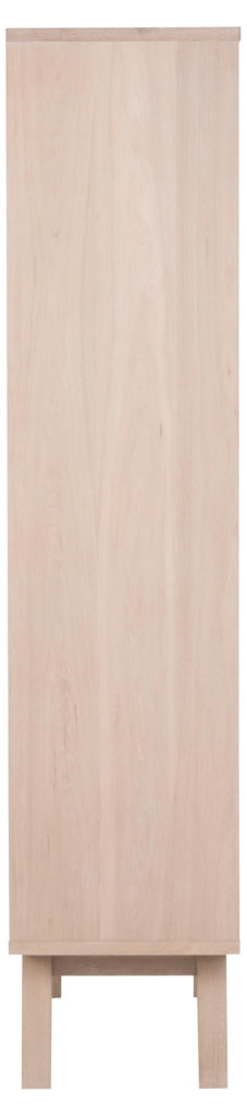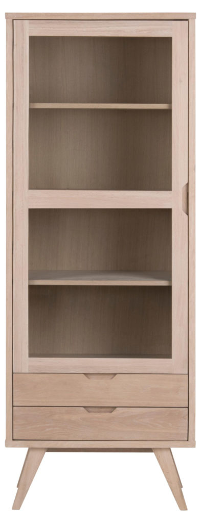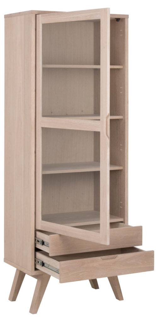 Unieke moderne vitrinekast geïnspireerd op Scandinavisch design. Tijdloos wit geolied eiken en eikenfineer. Praktisch met 2 laden, 3 verstelbare planken achter glazen deur. Eenvoudige montage met metalen geleiders. Duurzaam en stijlvol.