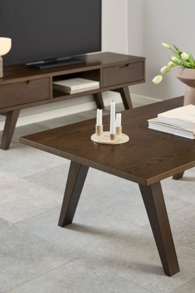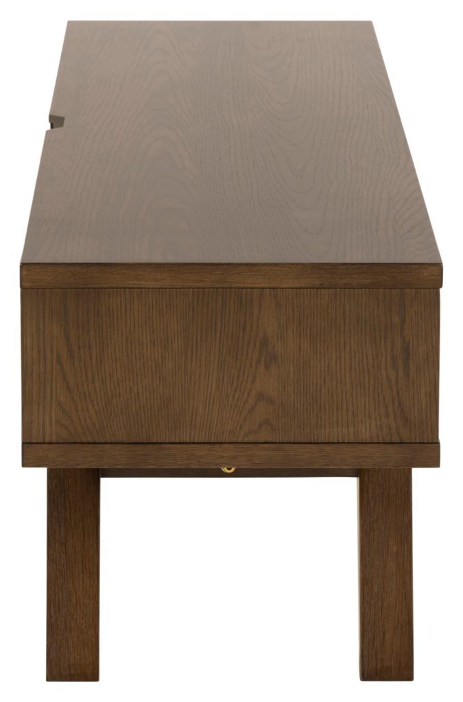 Modern tv-meubel met Scandinavisch design, met 2 lades en een open vak voor overzichtelijke opbergruimte. Gemaakt van gerookt eikenfineer, met een natuurlijke charme. Eenvoudige montage, grijze kleur en stevige spaanplaatconstructie. Perfect voor een moderne woning.