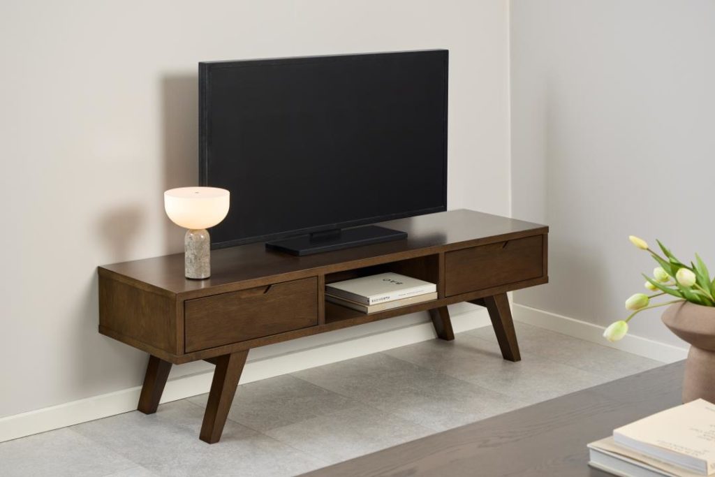 Strakke A-Line TV-meubel met gerookte eiken afwerking, 2 laden en een modern ontwerp. Afmetingen: 150x40x45 cm. Perfect voor elke woonruimte.