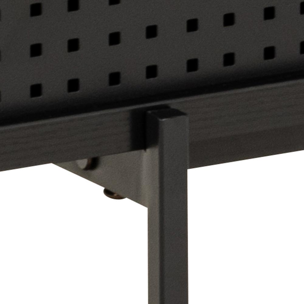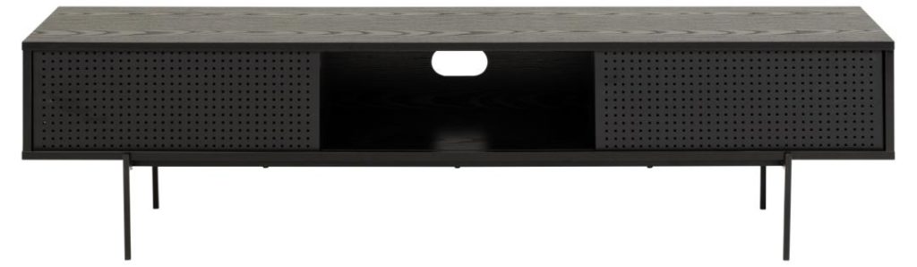 Angus tv-meubel in stijlvolle zwarte afwerking met metalen gaasdetails. Inclusief 2 deuren, open plank en schuifdeur voor opbergruimte. Stevige gepoedercoate stalen basis. Afmetingen: 180x40x44.5 cm."