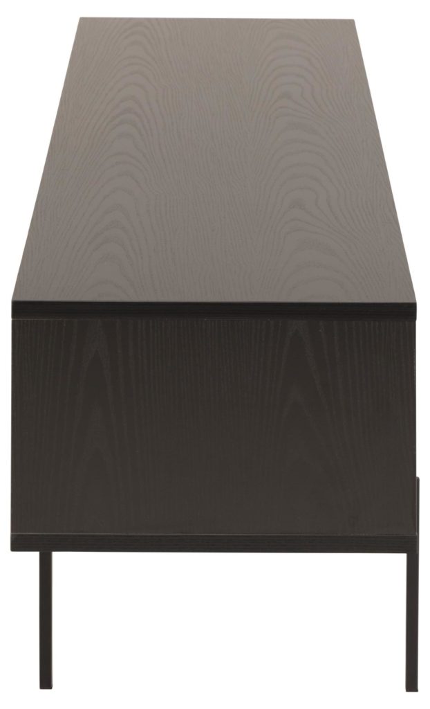 Modern TV-meubel in zwart essen-look met poeder gecoate metalen poten. Voorzien van schuifdeuren met gaas. Stevige montage.