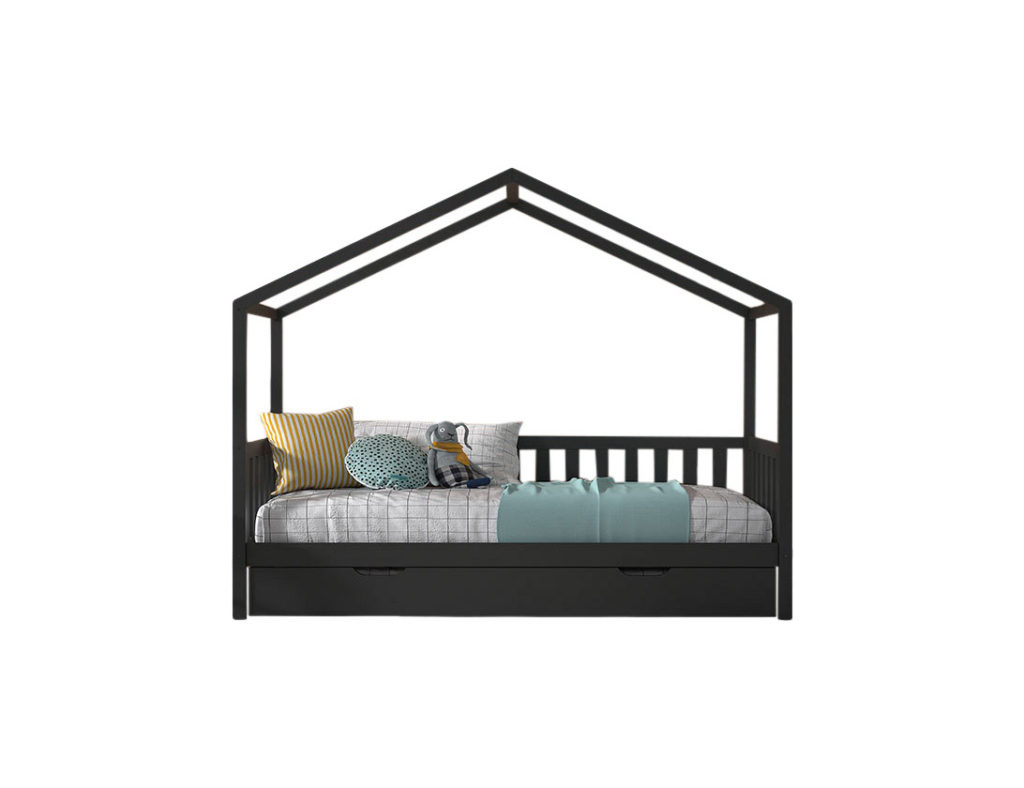 Het DALLAS huisbed (90x200) in antraciet is vervaardigd in massieve den. Het minimalistische en stijlvolle design maakt dat het in elk interieur past. Dit bed beschikt over een hekje langs 3 kanten dat kan dienen als uitvalbeveiliging, maar dat ook ideaal is als zitbank. Maak het extra gezellig met kleurrijke kussens, dekentjes en een lichtslinger als decoratie. De bijhorende bedlade (90x200) is alsook gemaakt uit massief grenen. Er zijn wieltjes voorzien zodat de lade gemakkelijk kan worden in- en uitgetrokken. Het rolbed kan ingezet worden als extra slaapplaats voor logees of als opbergruimte.