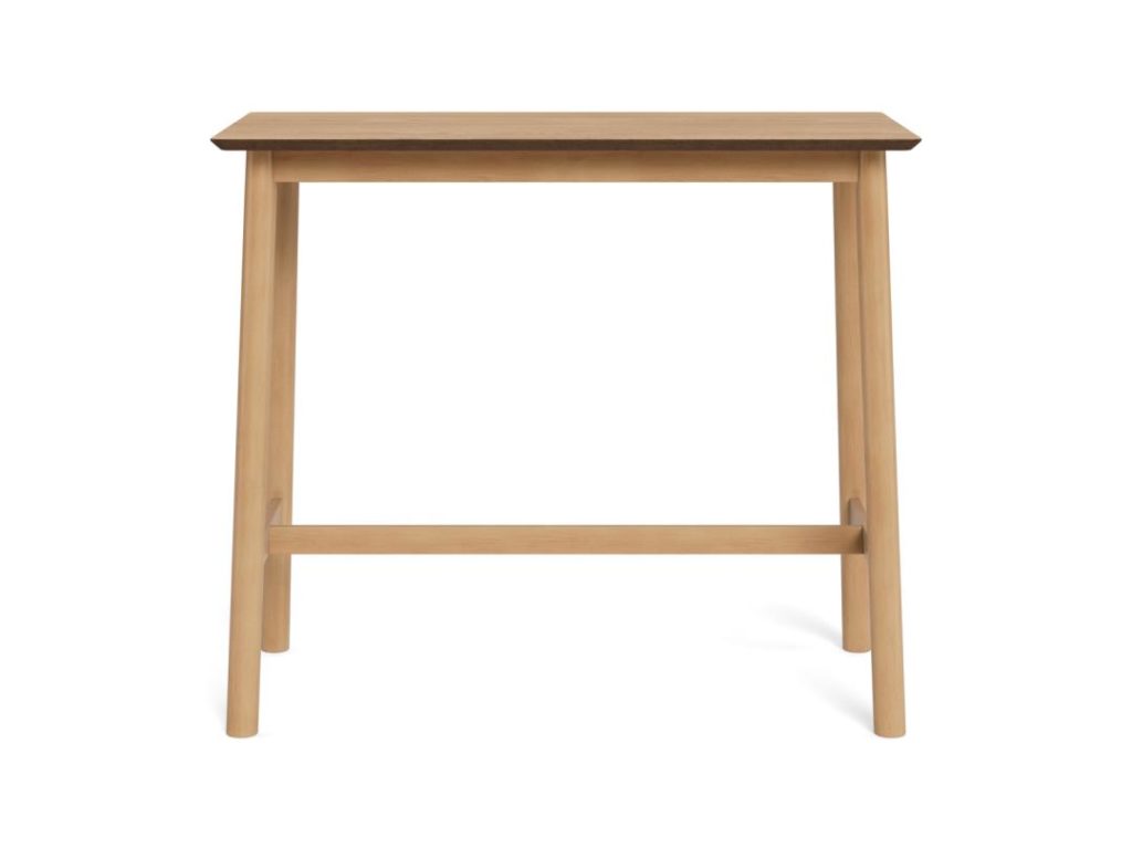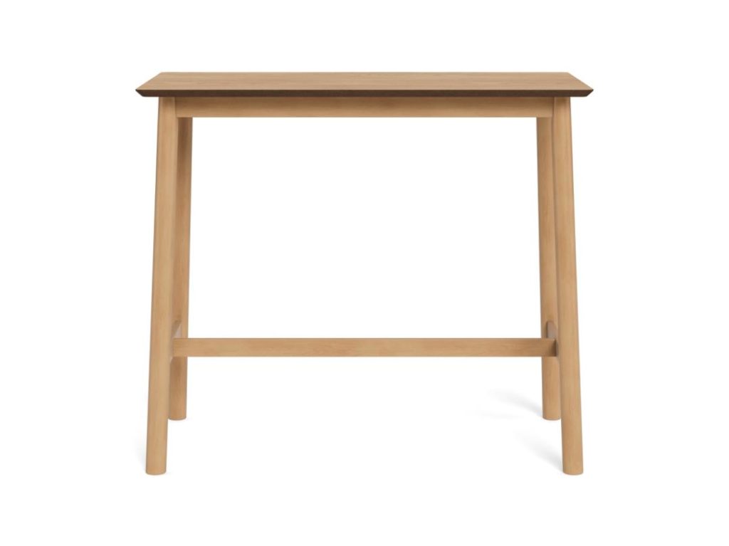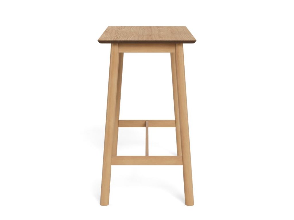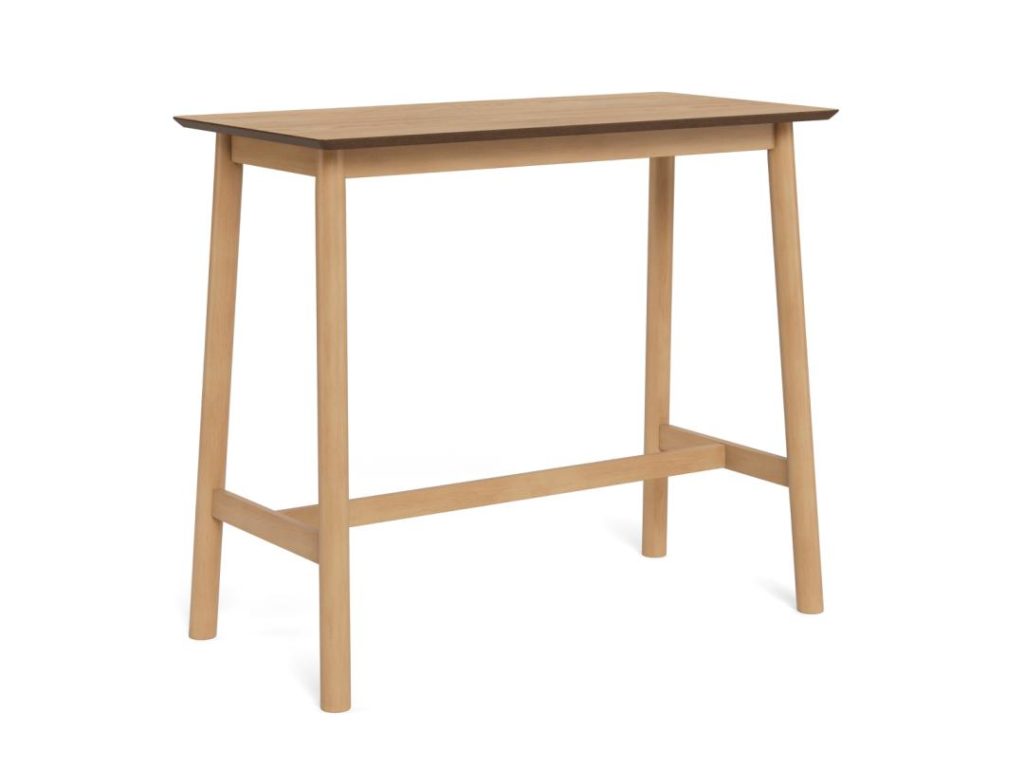 Stijlvolle Barlow rechthoekige bartafel met mat eikenfineerblad en rubberhouten onderstel. Strak ontworpen met een voetensteun voor comfort. Afmetingen: 120x60x105 cm. Perfect voor bijeenkomsten en moderne interieurs.