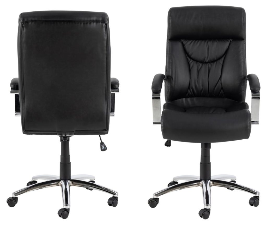 Ontdek ultiem comfort met deze zwarte bureaustoel van imitatieleer. Hij heeft een gewatteerde rugleuning, armleuningen, een draaivoet en wielen voor mobiliteit. Verstel de zitpositie eenvoudig met de kantelknop en het gasliftmechanisme. Functionele functies zijn onder andere de remwielen wanneer ze niet in gebruik zijn. Monteer hem moeiteloos en geniet van een stijlvolle en praktische toevoeging aan uw werkplek.