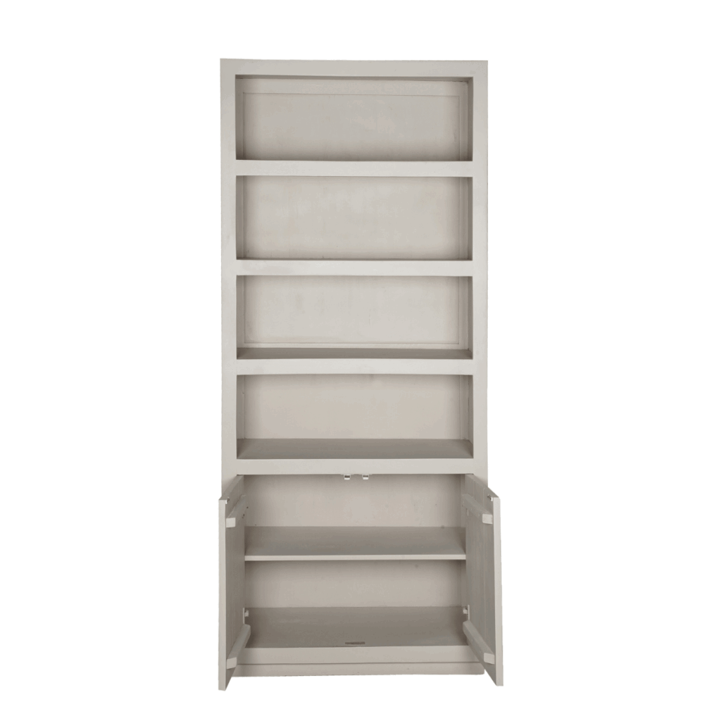 Ontdek Boekenkast Brussel, gemaakt van mangohout en afgewerkt met een stijlvolle sand finish. Deze kast combineert een stijlvol en strak design met functionaliteit. Met vier open vakken, inclusief legplanken, en twee greeploze deuren uitgerust met een handig push-to-open systeem, biedt deze kast een perfecte balans tussen opbergruimte en presentatie.