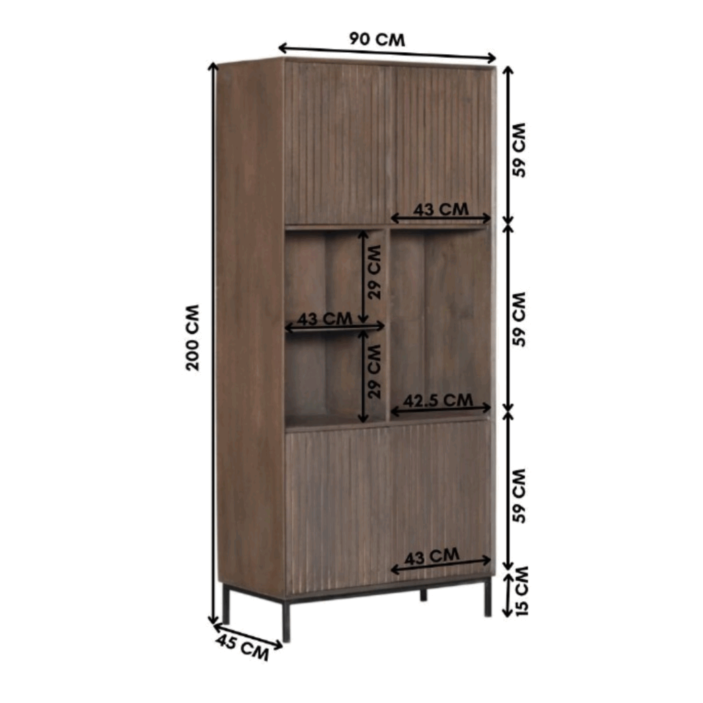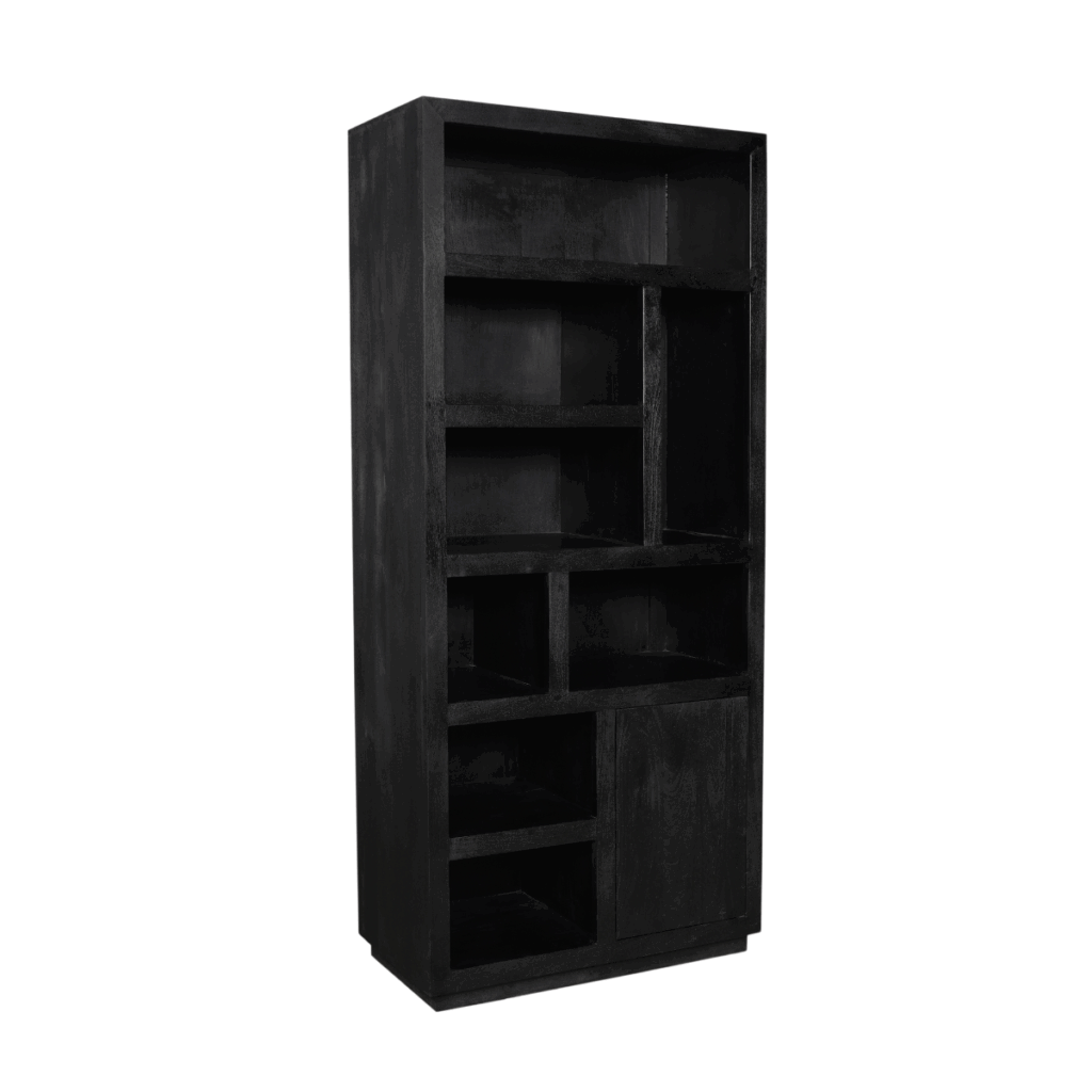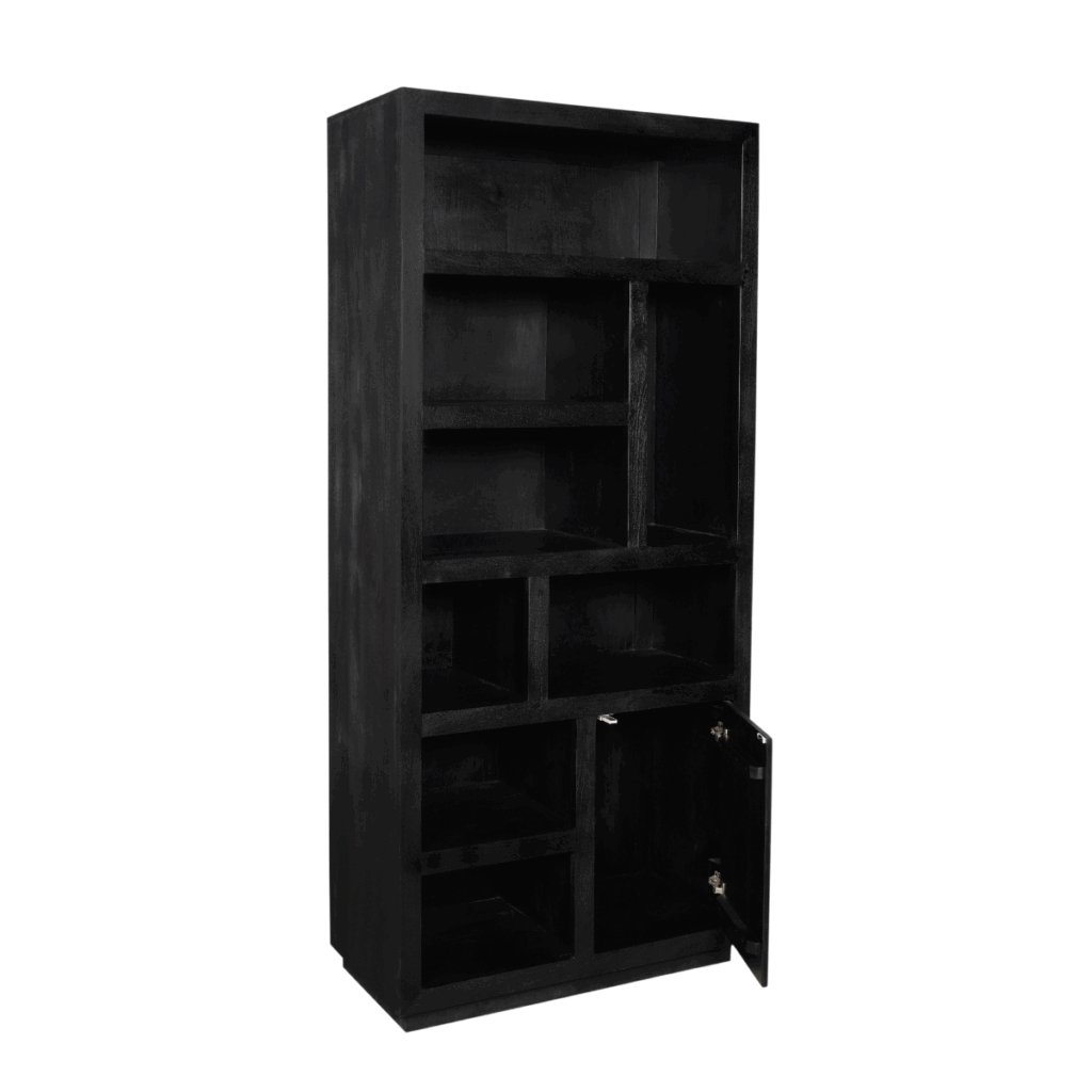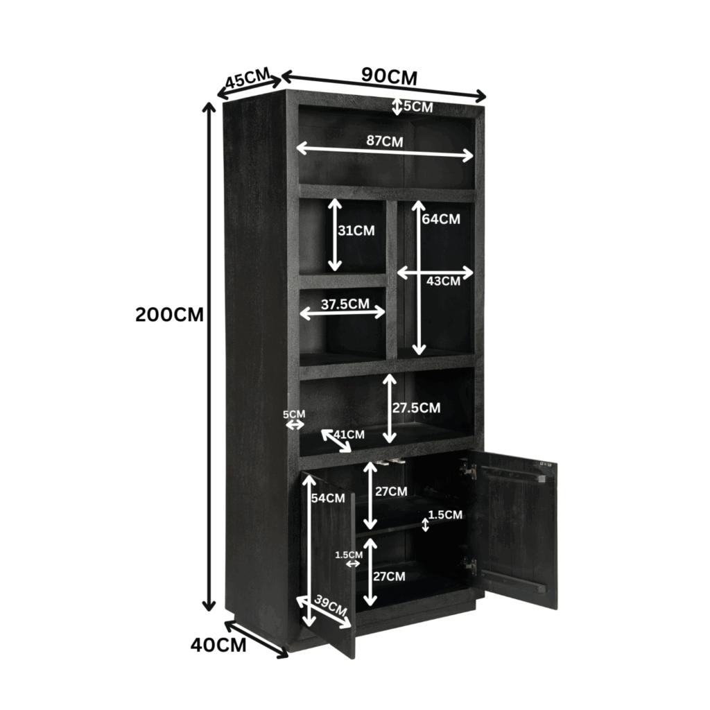 Ontdek Boekenkast Brussel Black, gemaakt van mangohout en afgewerkt met een prachtige black finish. De boekenkast heeft een strak en modern design, waarbij functionaliteit en stijl samenkomen. Met vijf open vakken en twee greeploze deuren, voorzien van een push-to-open systeem, biedt deze kast niet alleen voldoende ruimte voor het tonen van boeken en decoratieve items, maar ook voor het handig opbergen van diverse items.