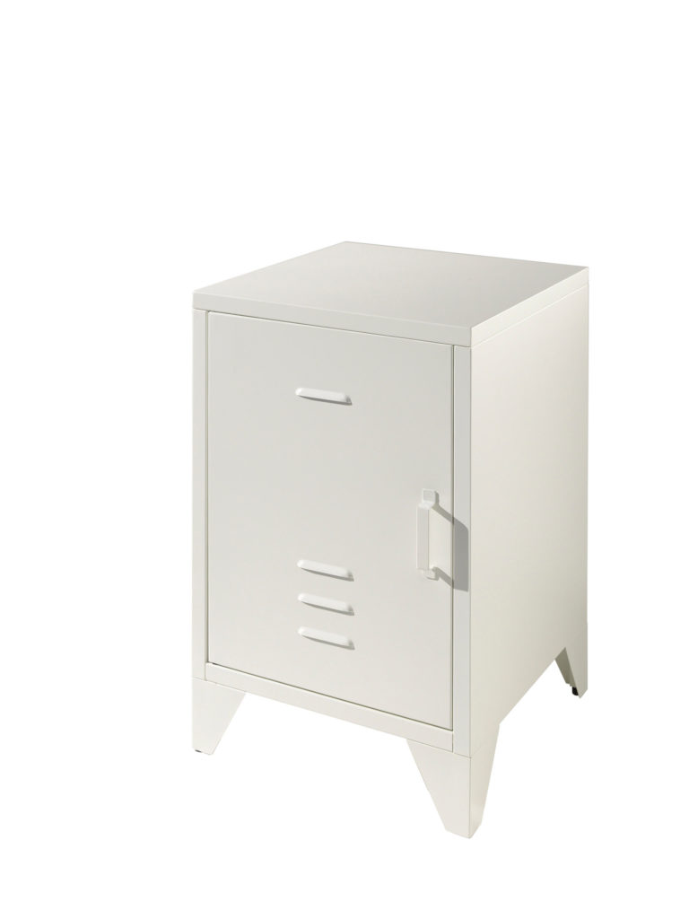 De metalen BRONXX nachttafel heeft een industriële look met een afwerking in het mat wit.