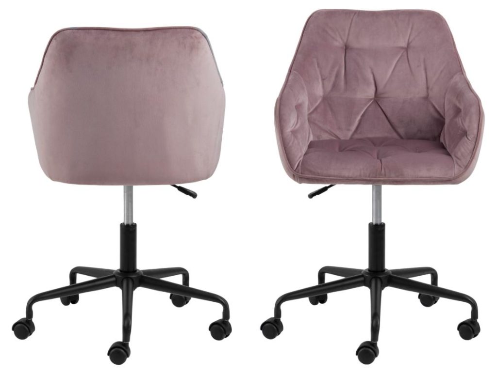 Stijlvolle Brooke bureaustoel met armleuningen, Vic stof in oudroze. Matzwarte stalen 5-sterren voet met remwielen, gasveer, draaibaar en knoopdetails. Perfect voor een chique en comfortabele werkplek.