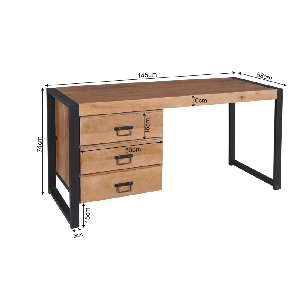 Dit bureau komt uit onze Boaz serie en is voorzien van drie lades. Het bureau is uitgevoerd in massief mangohout. Het mangohout is behandeld met een beschermlaag. Op de lades zitten metalen hangrepen, die zijn afgewerkt met een zwarte lak.