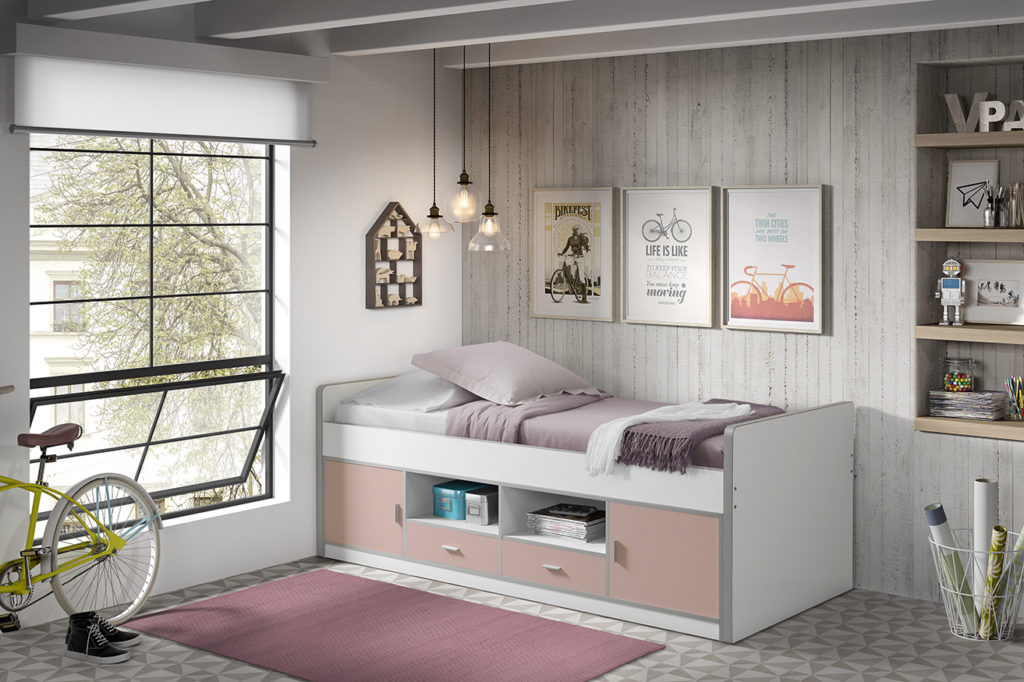 Bespaar plaats in de kinderkamer dankzij dit trendy kajuitbed BONNY met lichtroze accenten. Dit bed vervaardigd uit hoogwaardig spaanplaat en massief MDF heeft onderaan 2 kasten, 2 lades en 2 open opbergvakken. De lattenbodem is inbegrepen.