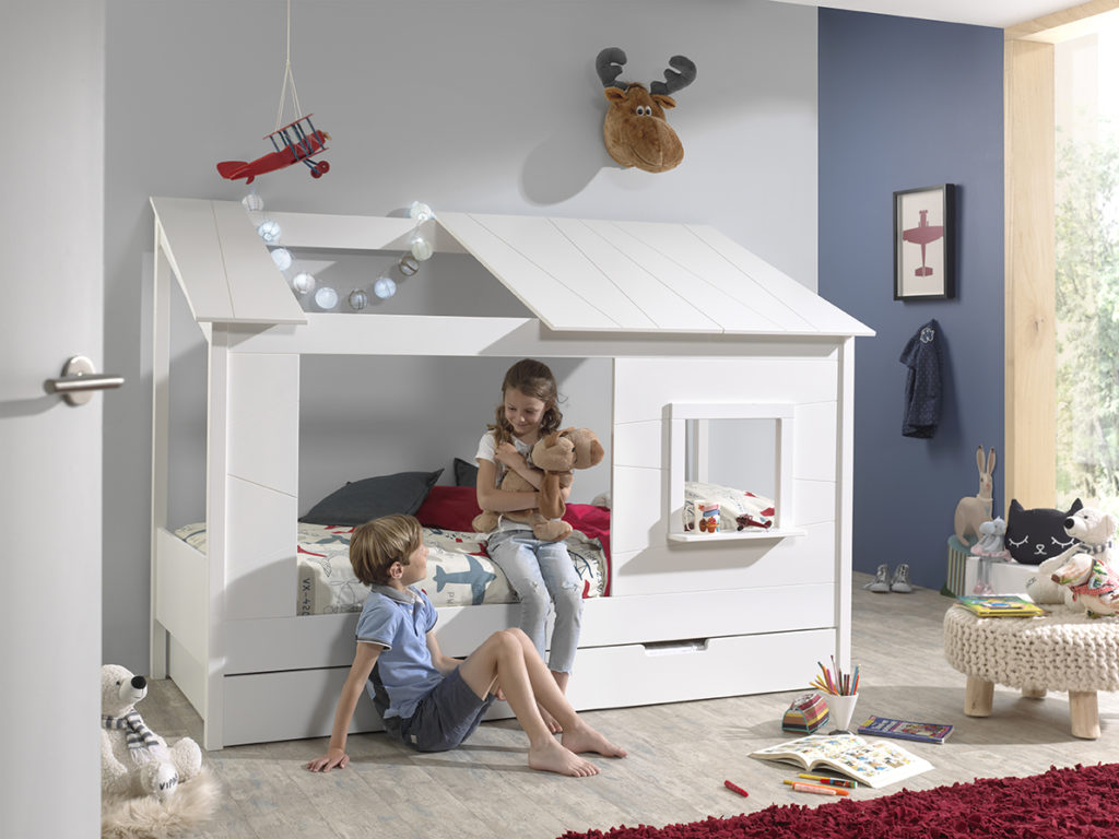 Dit huisbed in wit (90×200) uit de HOUSEBED collectie is vervaardigd uit massieve den en hoogwaardig gelakte MDF. Door het raam dat werd toegevoegd is dit net alsof je in een boomhut zit. Bij deze combinatie zijn white roof en een bedlade inbegrepen.