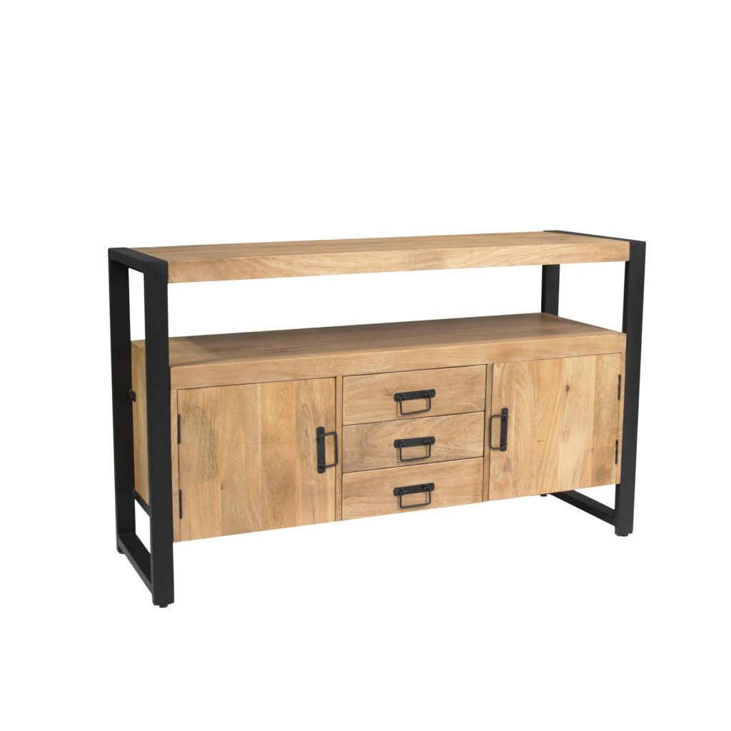Dressoir Boaz: handgemaakt mangohouten buffet met lichte finish, zwart gelakt metalen frame en grepen. Drie lades, twee deuren en ingelegde houtstroken voor een eigentijdse uitstraling. Robuust, uniek karakter door kleine onregelmatigheden. Afm. 135×45×80 cm.