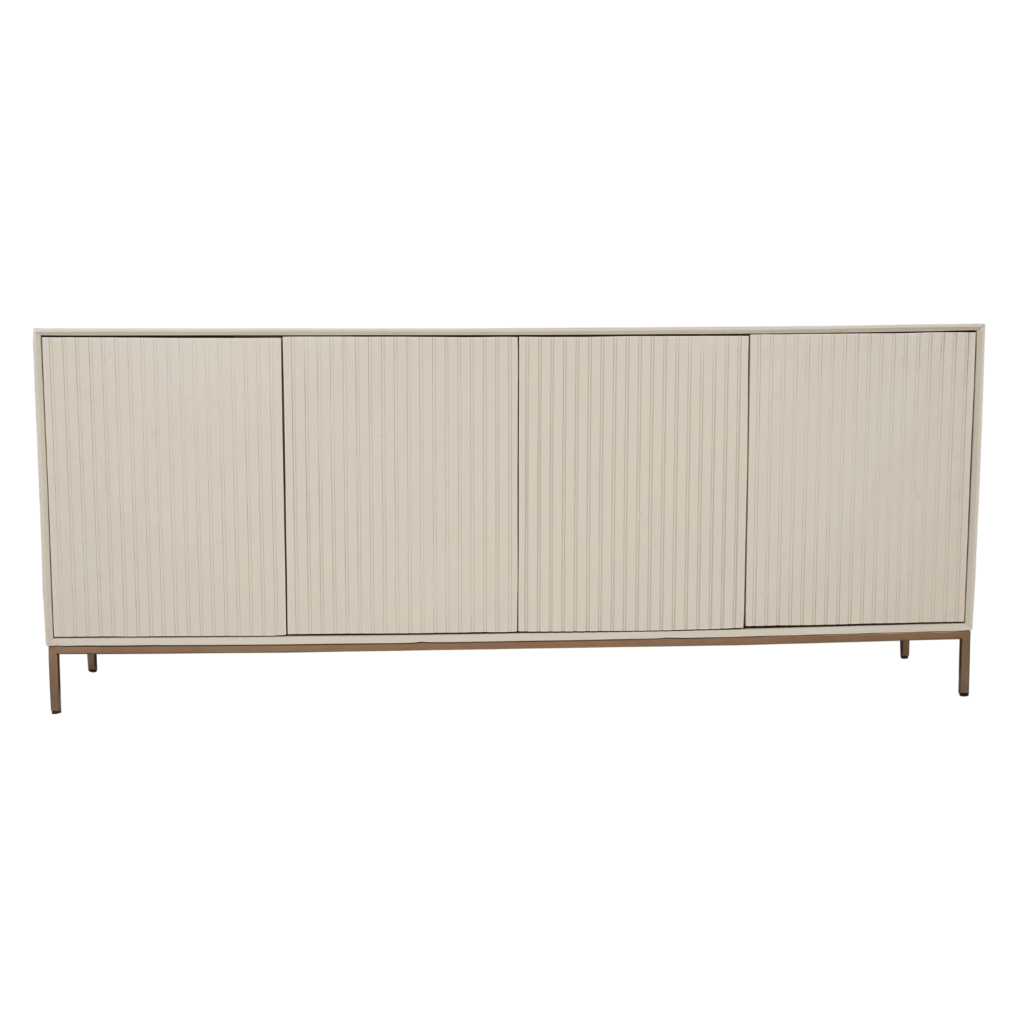Het dressoir Madison Sand is vervaardigd uit licht gezandstraald mangohout met een verfijnde sand finish. Het bronzen metalen frame voegt een elegant accent toe. Met vier deuren met verticaal lattenpatroon biedt dit dressoir een moderne en tijdloze uitstraling. Afmetingen: B210 x D45 x H85 cm. Onderhoud: afnemen met een lichtvochtige doek.