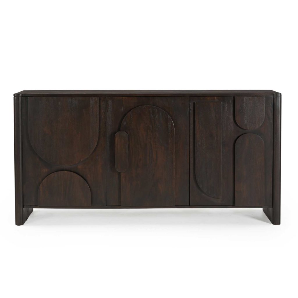Dressoir Zana — modern, karaktervol mangohouten meubel in warm bruin. Organische fronten, ruime opbergruimte achter deuren. Afmetingen: B160 × D40 × H80 cm. Onderhoud: afnemen met lichtvochtige doek. Perfect voor een stijlvolle, praktische woonkamer.