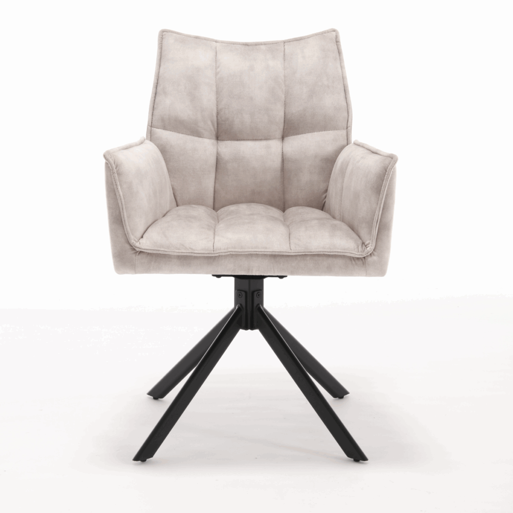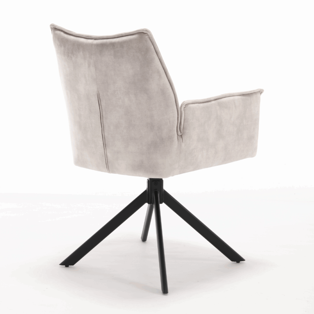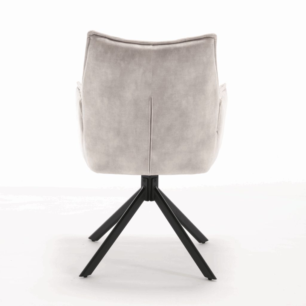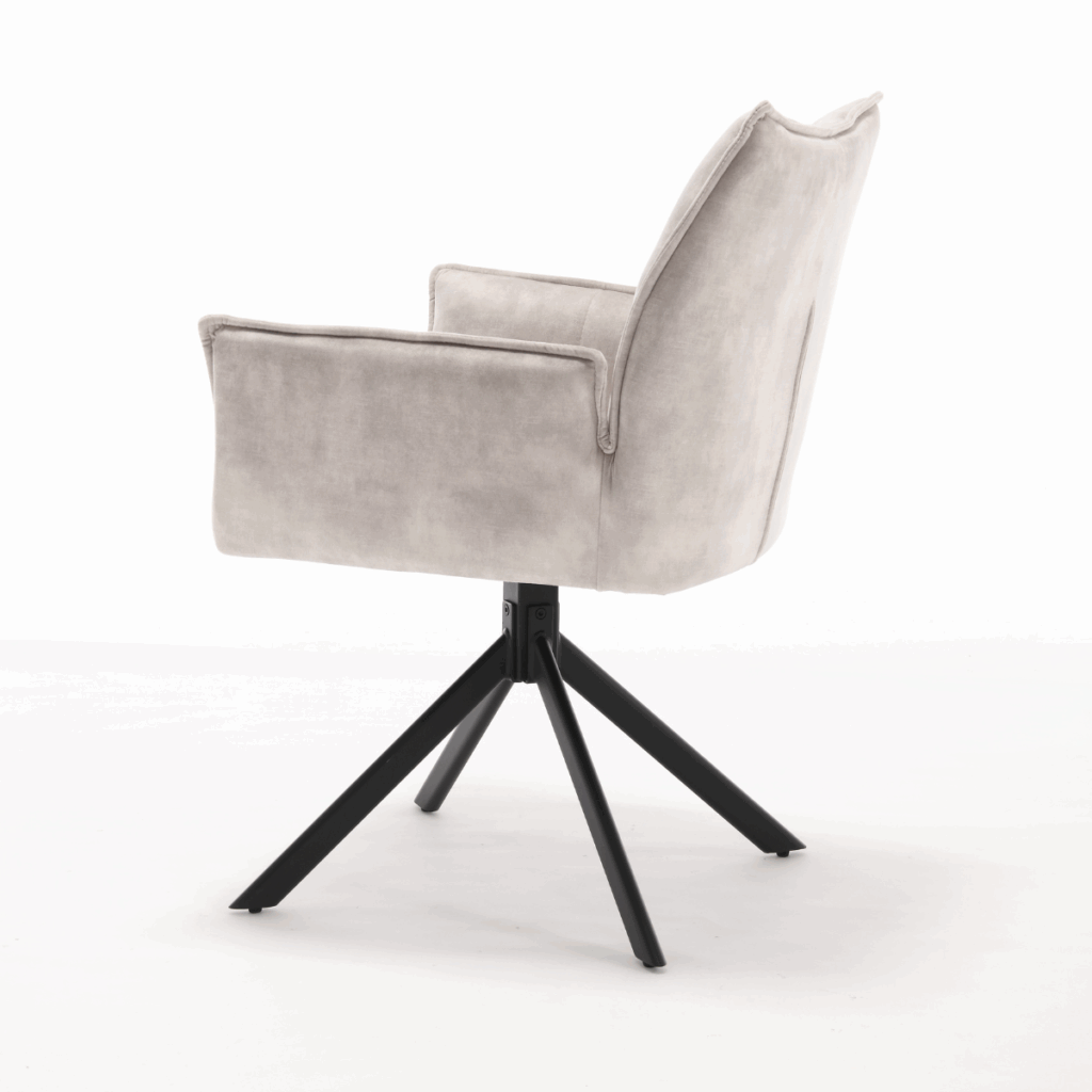 Eetkamerstoel Dani Velvet Champagne is bekleed met velvet-stof. De stoel is 180 graden draaibaar en heeft een return memory functie. De stoel is voorzien van een metalen zwarte poot.
