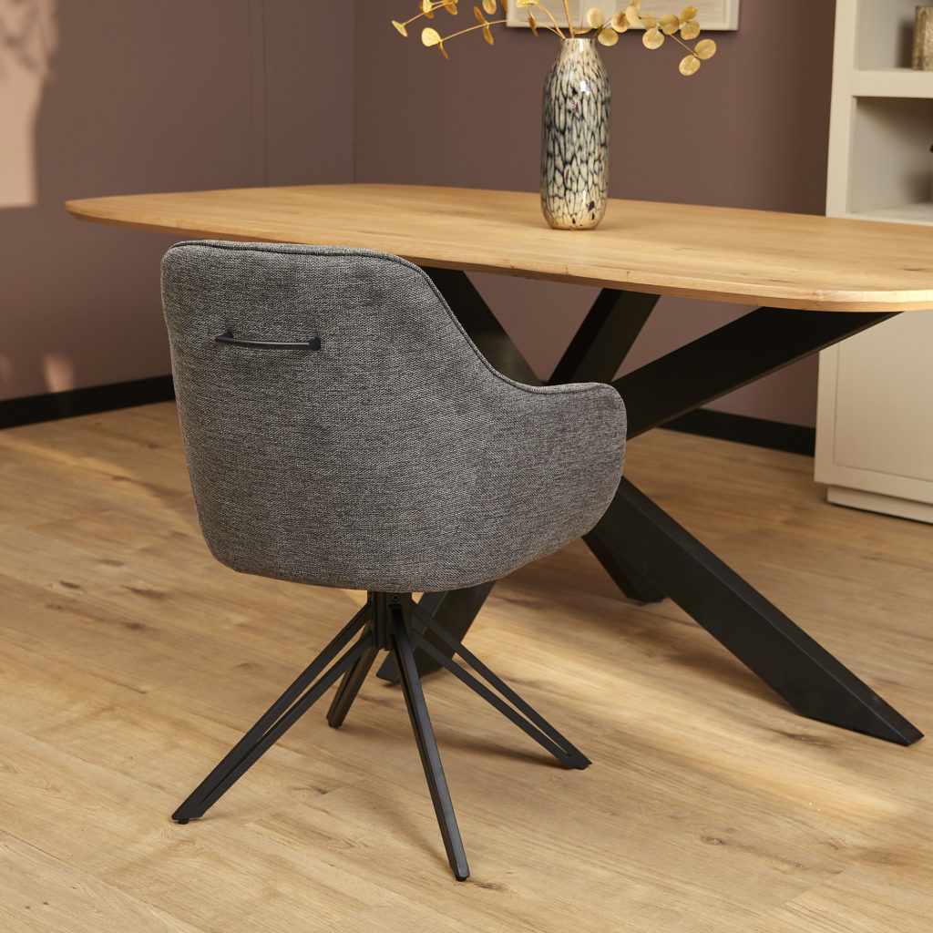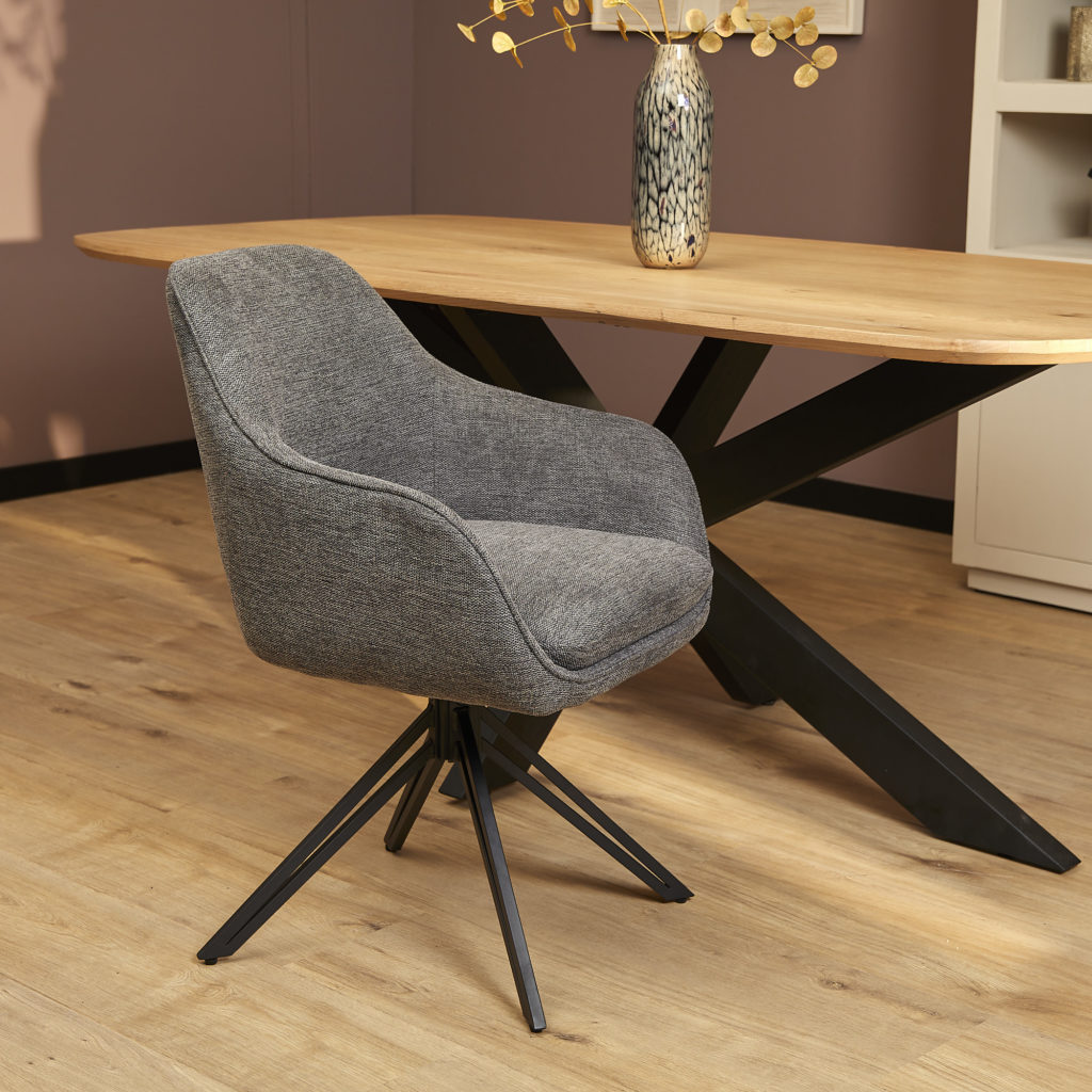 Eetkamerstoel Jens is bekleed met de Brego-stof. De stoel is 180 graden draaibaar en heeft een return memory functie. De stoel is voorzien van een metalen zwarte poot.