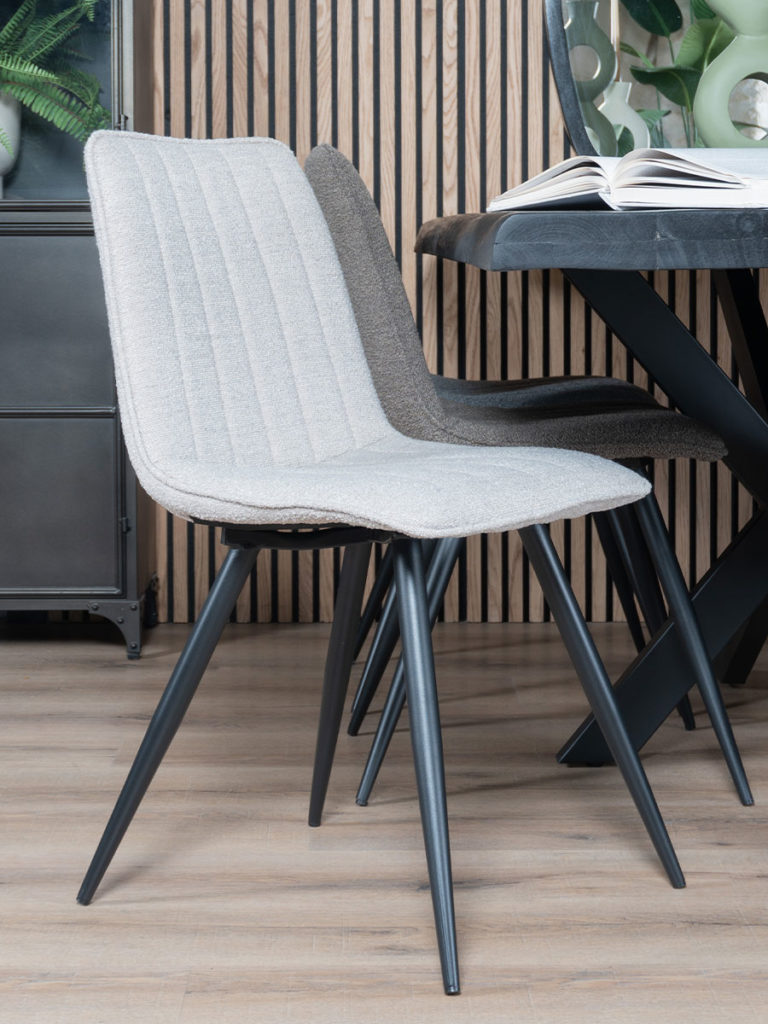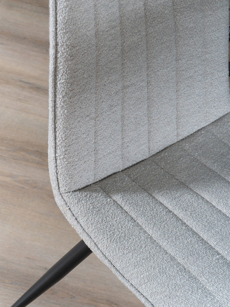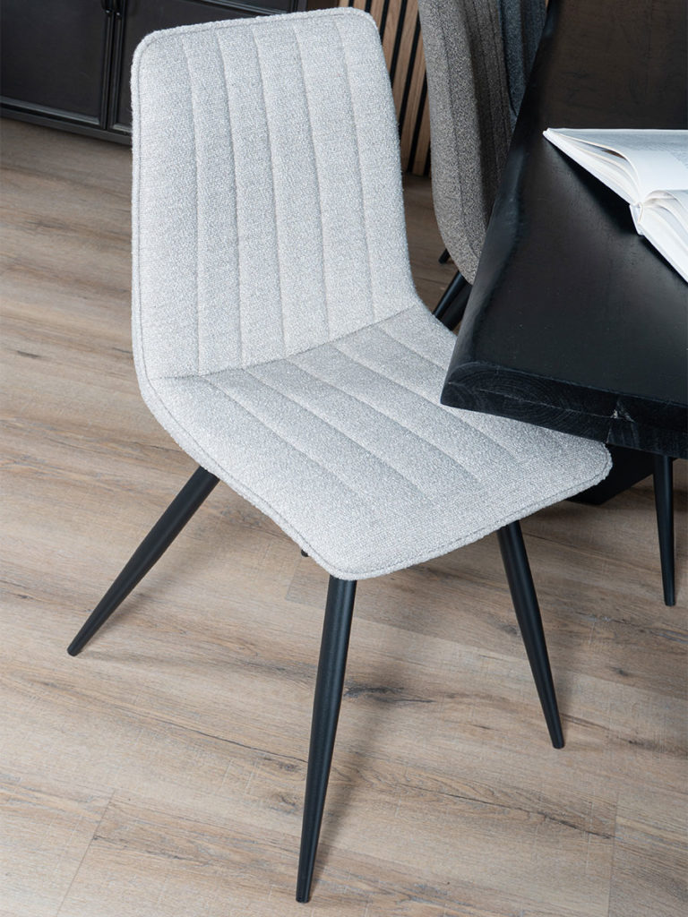 Eetkamerstoel Joppe is bekleed met een zachte boucle stof, wat zorgt voor een luxueuze en comfortabele zitervaring. Dankzij het kuipstoelontwerp is de stoel makkelijk onder de eettafel te schuiven, waardoor hij praktisch en ruimtebesparend is. Hij neemt niet veel ruimte in beslag rondom de tafel, waardoor je meer stoelen rondom je eettafel kwijt kunt. Eetkamerstoel Joppe is verkrijgbaar in 3 kleuren: Natural, Ivory, Brown en Grey.
