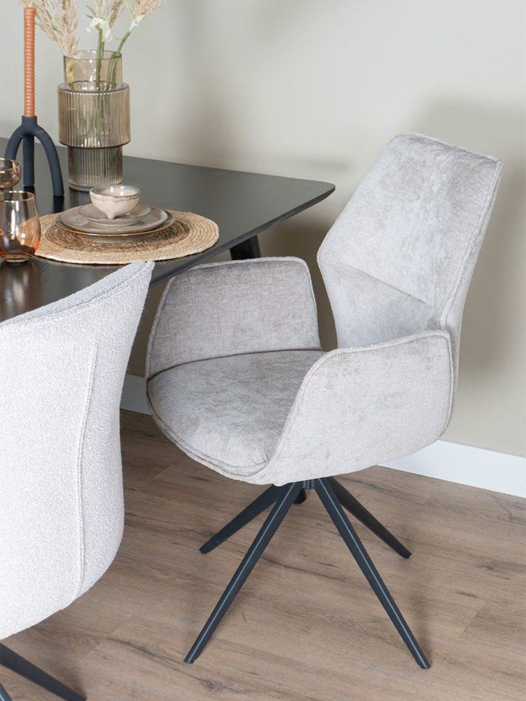 Met zijn unieke draaistoelmechanisme van 360 graden biedt de eetkamerstoel Miley een ongeëvenaarde vrijheid en gemak, waardoor je moeiteloos kunt bewegen terwijl je dineert of gezellig bij elkaar zit. Miley is beschikbaar in twee luxueuze stoffen - Perfect Harmony en Bouclé - zodat je kunt kiezen wat het beste bij jouw stijl past. Perfect Harmony staat voor verfijning met zijn gladde textuur en tijdloze uitstraling, terwijl Bouclé een vleugje textuur en warmte toevoegt aan elke ruimte. Wat de Miley echt onderscheidt, is zijn unieke ontwerp waarbij de elegante armleuningen naadloos overlopen in de rugleuning van de stoel. Als je een statement wilt maken met je interieur, staat de eetkamerstoel Miley voor een perfecte combinatie van comfort en stijl. Ervaar het zelf en geef je eettafel een upgrade met de Miley!
