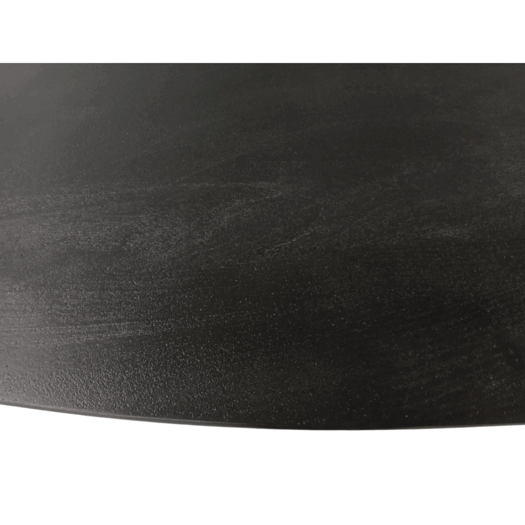 Ovale eetkamertafel Brandy Black heeft een tafelblad van massief mango hout en een zwart gelakte metalen matrixpoot. Het blad is afgewerkt met een zwarte finish en is licht gezandstraald.