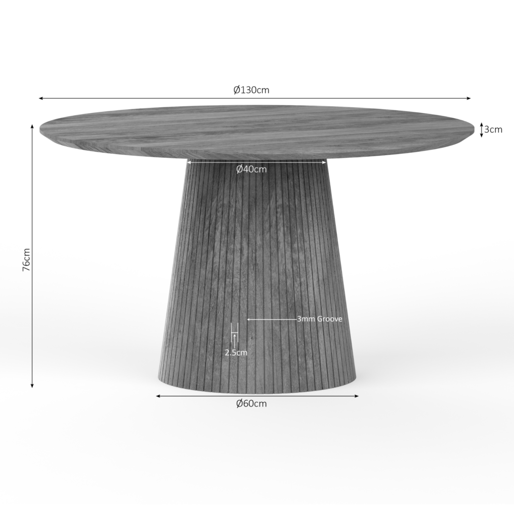 Eettafel Solana — stijlvolle, tijdloze mangohouten ronde tafel Ø130×H76 cm met karakteristieke verticale lattenpoot. Handgemaakt en uniek; voor circa 5 personen. Onderhoud: afnemen met lichtvochtige doek. Zelfmontage.