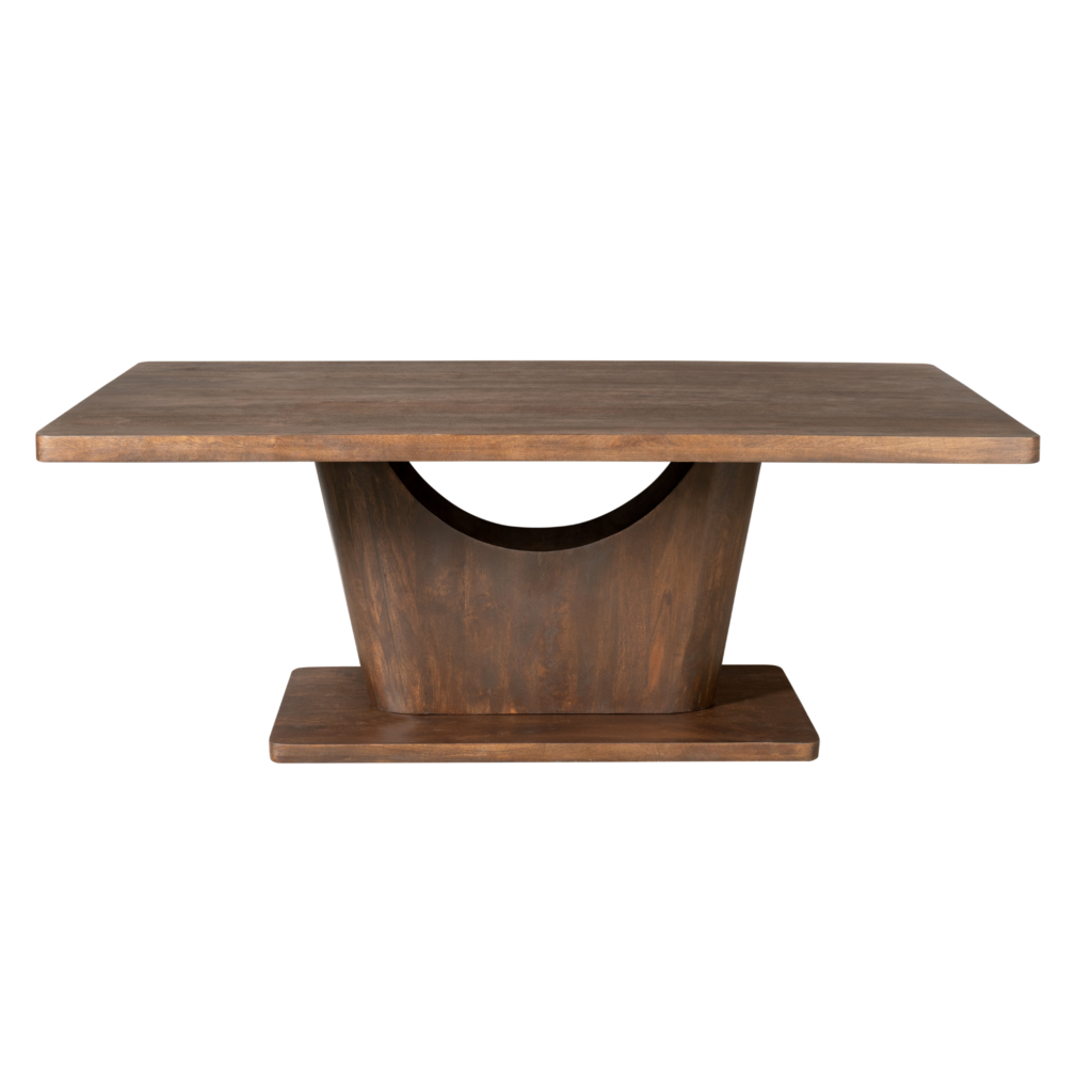 Eettafel Voco — robuust mangohout met warme bruine finish. Strak, modern design; royaal 240×110×76 cm, massief blad en stevige pootopbouw. Uniek handgemaakt karakter; eenvoudig te monteren. Onderhoud: afnemen met een lichtvochtige doek.
