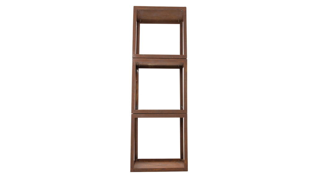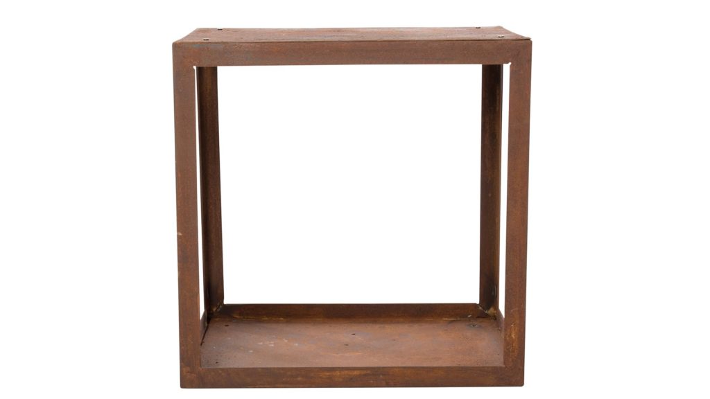 Robuuste stalen constructie (1,5–3 mm) in roestkleur. Compact 50×40×50 cm, 10 kg — duurzaam, stevig en stijlvol industrieel design. Perfect als buitenobject of eyecatcher in huis.
