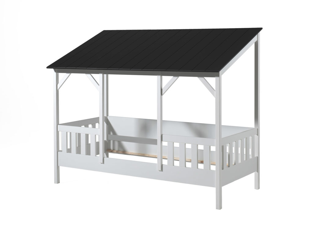 Dit huisbed in wit met zwart dak (90x200) uit de HOUSEBED collectie is vervaardigd uit massieve den en hoogwaardig gelakte MDF. Rondom het bed is een hekje voorzien om de veiligheid van het bed te garanderen.