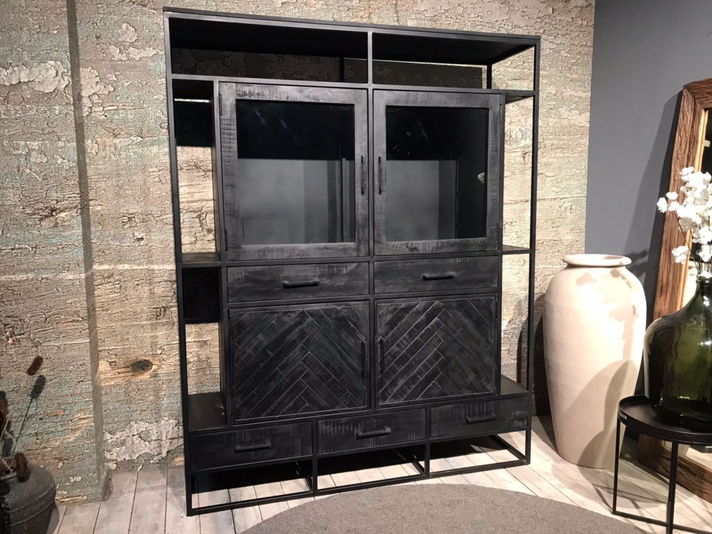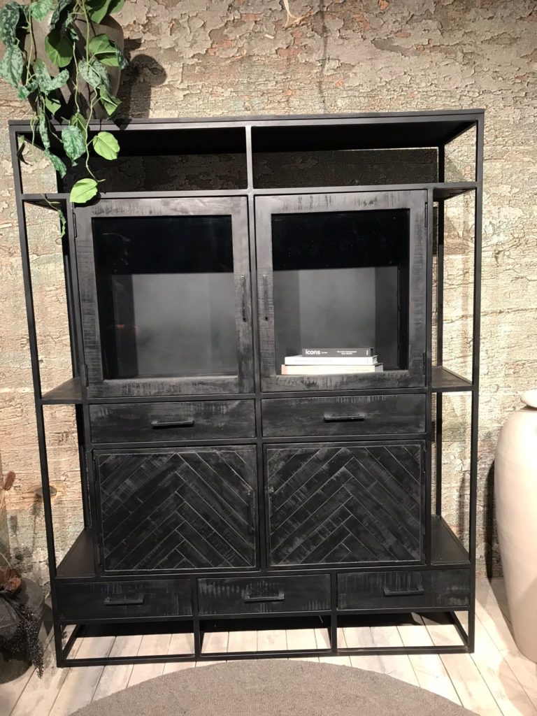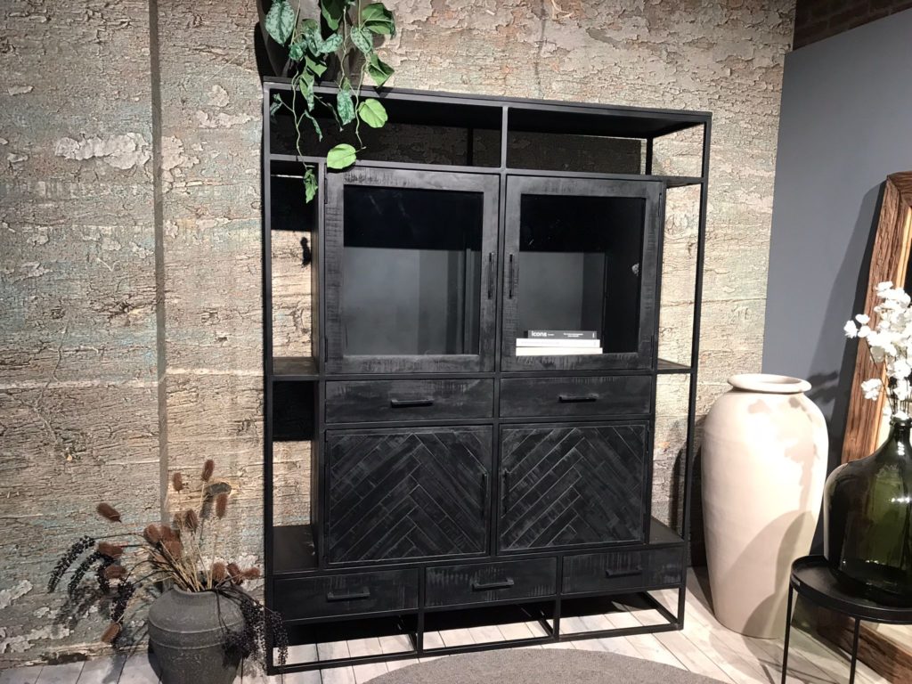 Unieke industriële kast met diverse lades en dichte en open deuren.