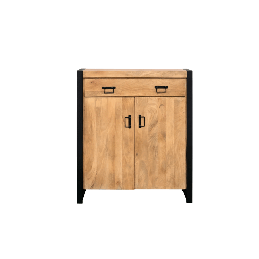 Kabinet kast Boaz is gemaakt van massief mangohout. De kabinet kast heeft twee deuren en één lade. Het massieve mangohout is behandeld met een naturel lak. Het zwart metalen frame en de metalen handgrepen zijn afgewerkt met een zwarte lak.