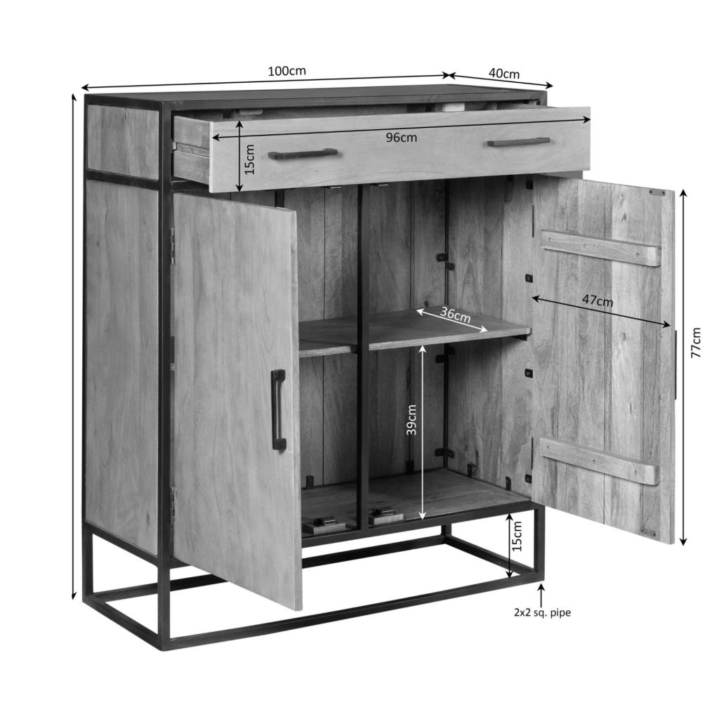Kabinet kast Denver is gemaakt van massief mangohout. De kabinet kast heeft twee deuren en één lade. Het massieve mangohout is behandeld met een transparante lak. Het zwart metalen frame en de metalen handgrepen zijn afgewerkt met een zwarte lak.