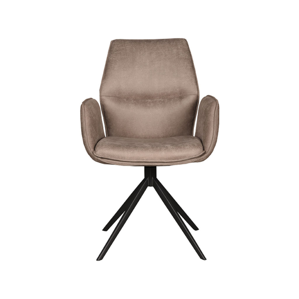 Eetkamerstoel Mellow van het merk LABEL51 is de perfecte combinatie van comfort en moderne elegantie. Deze stoel, bekleed Taupe Micro Suede materiaal, biedt een zachte textuur en uitnodigt uit om aan te raken. De stoel heeft een unieke armleuning en een kenmerkende zwarte metalen draaivoet, wat zorgt voor een stijlvolle twist in elke eetkamer.