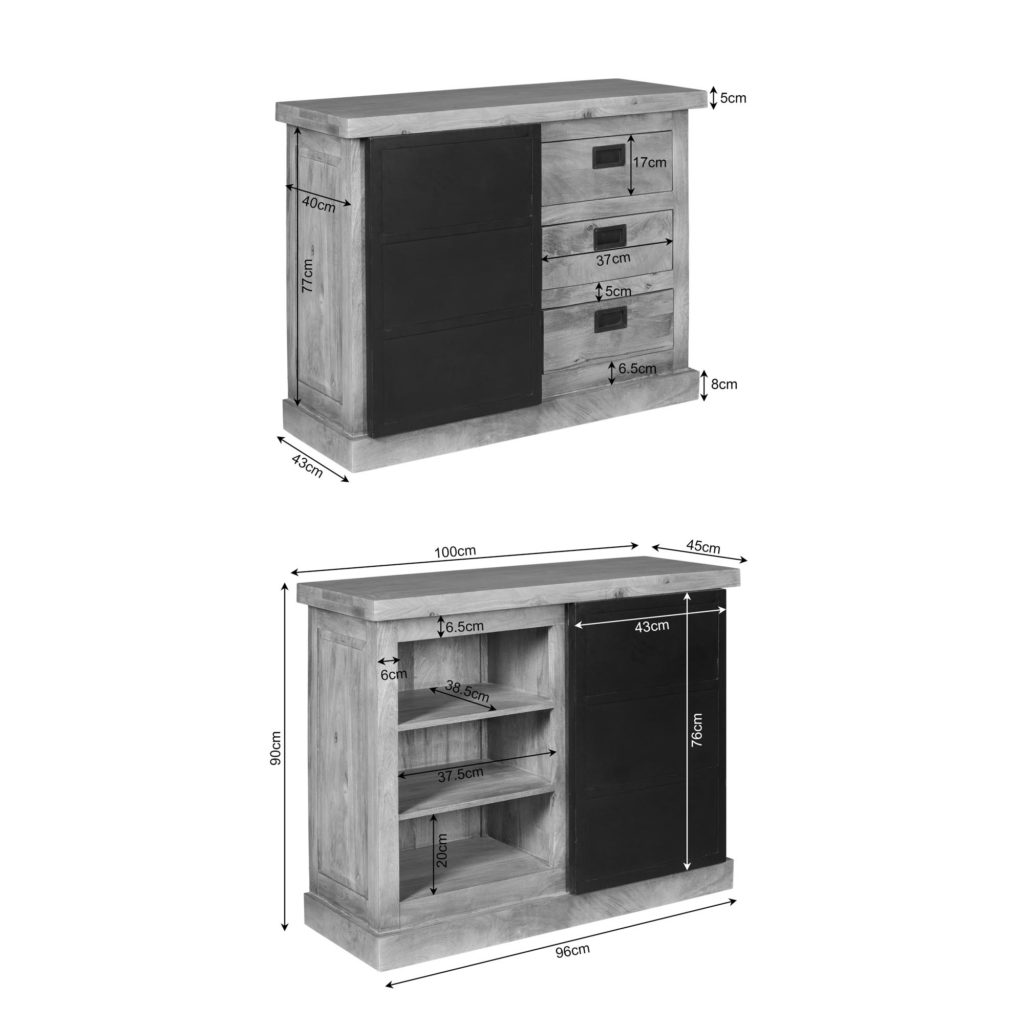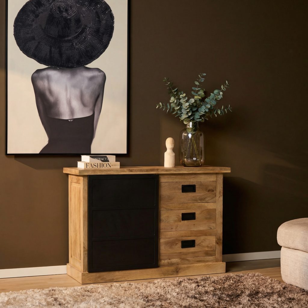 Ladekast Noa: handgemaakte mangohouten kast (100×45×90 cm) met lichte finish, zwart gelakte metalen deur, één deur en drie lades. Met ingelegde houtstroken voor een eigentijdse uitstraling. Unieke, ambachtelijke variaties. Onderhoud: afnemen met een lichtvochtige doek.