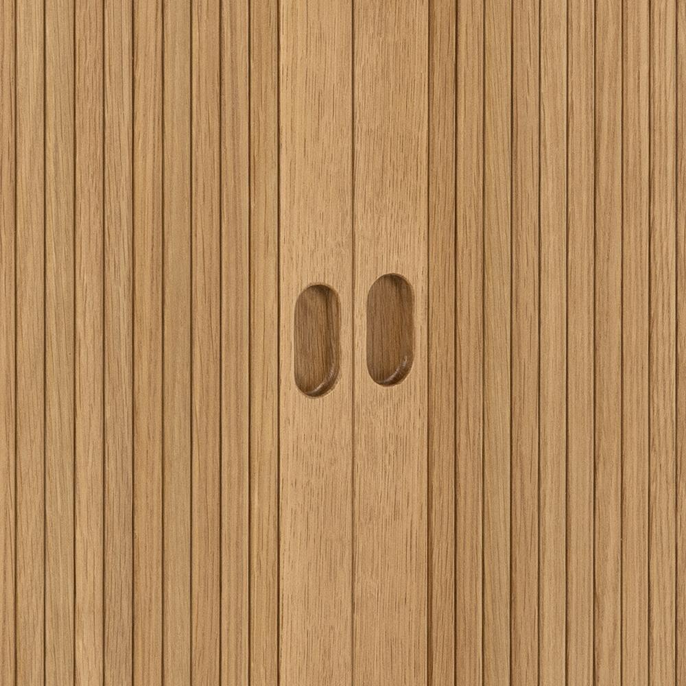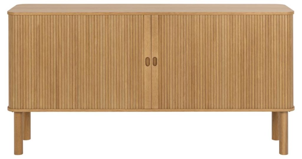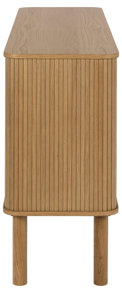 Verrijk je woonruimte met deze stijlvolle eikenhouten dressoir. Moderne vormgeving met ronde hoeken en lamellen details die elk interieur verfraaien. Inclusief 2 verstelbare planken voor opslag, lamellen front, schuif- en tambourdeuren. Met hoogwaardige materialen vervaardigd, voegt dit meubelstuk een vleugje elegantie toe aan je huis.