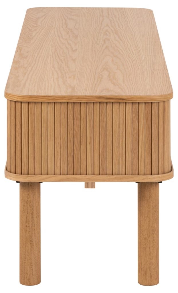 Elegant Langley TV-meubel met eikenfineer bovenblad, frame en deuren. Stijlvol met lamellen front, schuif- en roldeur. Afmetingen 140x40x45 cm. Perfect voor een moderne woonkamer. Verkrijgbaar in eiken- en walnoothouten afwerking. Breng elegantie in uw ruimte met het Langley TV-meubel.