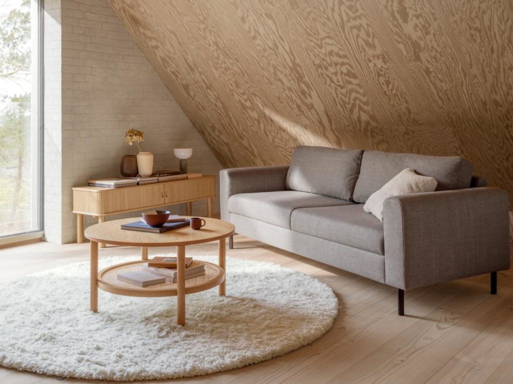 Een moderne TV unit met natuurlijke accenten, perfect voor diverse interieurstijlen. De lamellen, ronde vormen en gelakt eiken details geven een unieke uitstraling. Praktische opbergruimte achter de deur. Gemaakt van MDF en eiken fineer. Eenvoudige montage, geleverd in één pakket. Afmetingen: 140x40x45 cm.