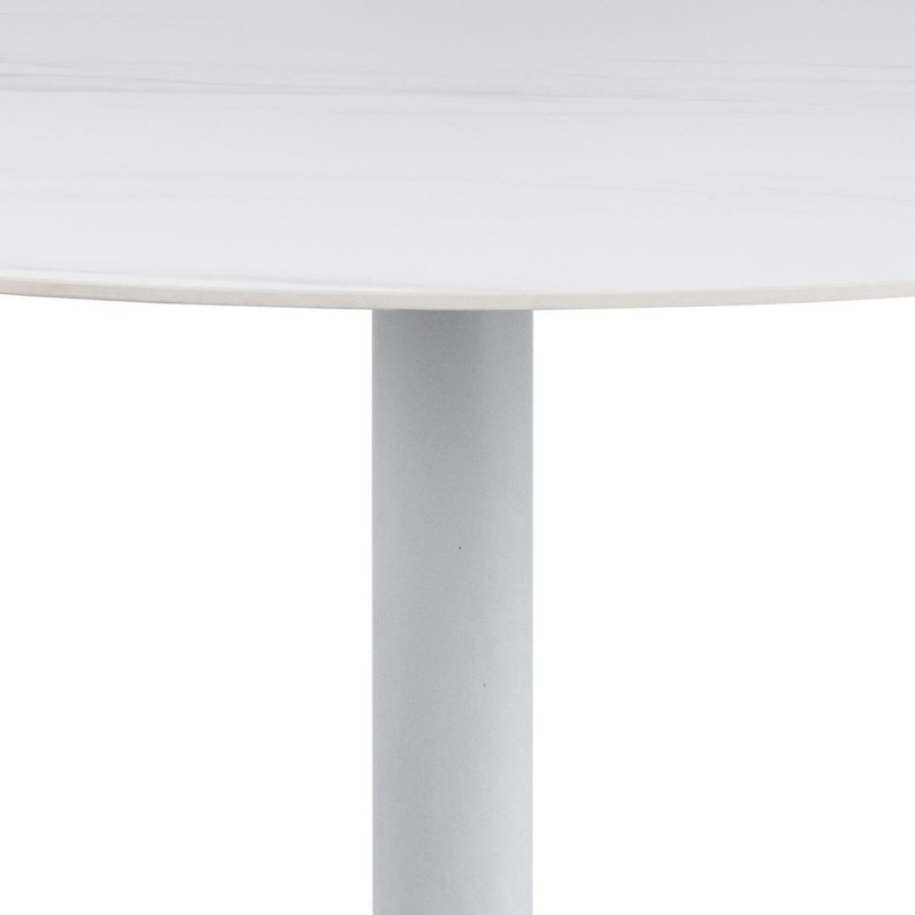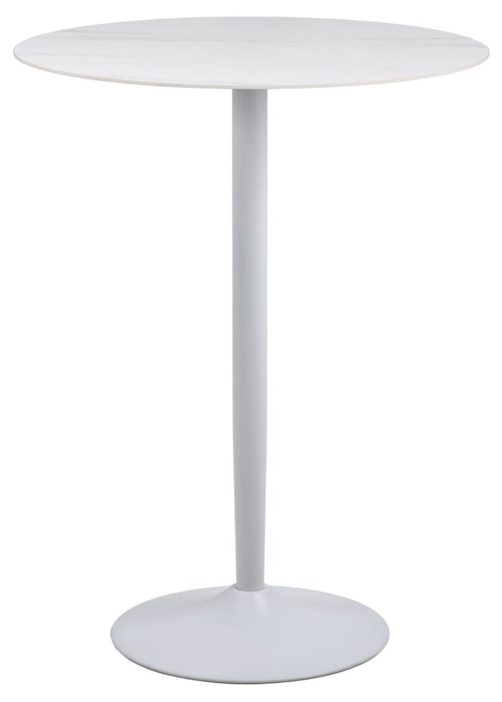 Stijlvolle Malta bartafel met wit keramisch blad en gepoedercoat stalen onderstel. Perfect voor moderne ruimtes. Afmetingen: Ø80x105 cm.