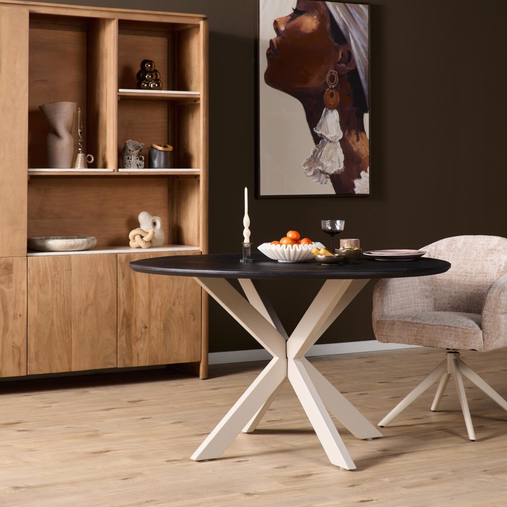 Matrixpoot: elegant metalen onderstel met sand finish. Afmetingen: B100×D100×H73 cm. Geschikt voor ronde tafelbladen 110–150 cm (110,120,130,140,150). Combineer met een stijlvol blad. Onderhoud: afnemen met een lichtvochtige doek.