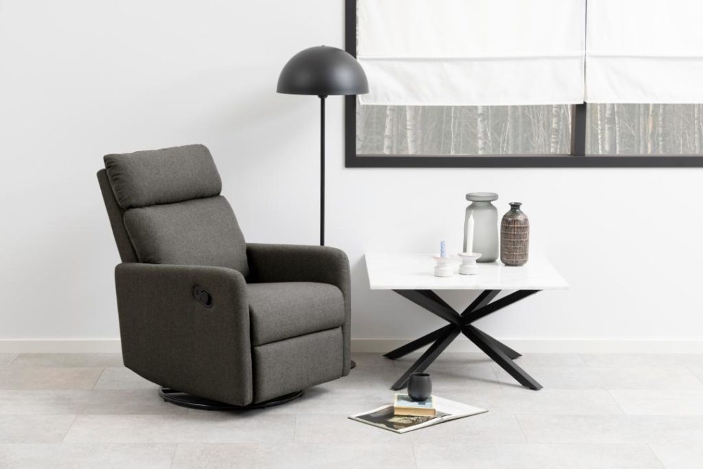Verbeter je ontspanning met de Mikkeli fauteuil in stijlvolle Sawana grijze stof. Voorzien van handmatige ligstand, pocketveren, schommelfunctie en draaibare voet op een stevige zwarte stalen basis. Afmetingen: 67x93.5x99 cm.