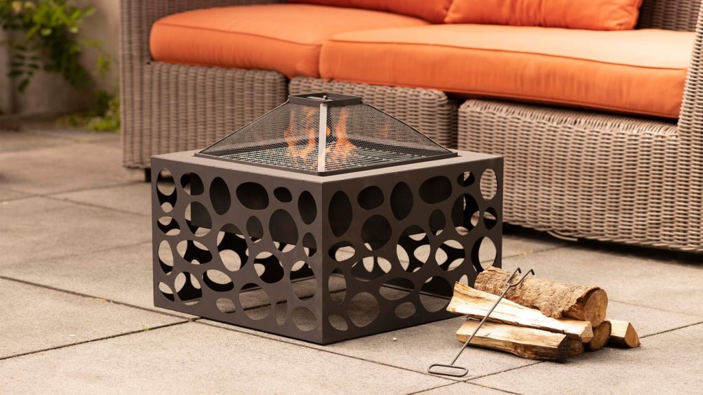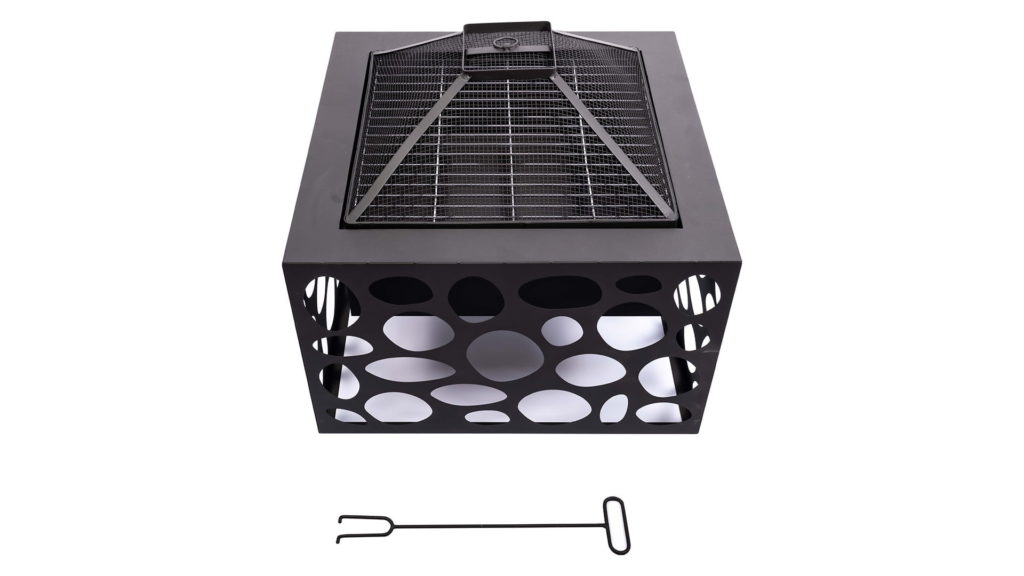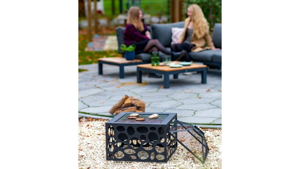 De robuuste RedFire Mikor vuurschaal met grillrooster combineert strak design en aangename warmte. Het vierkante model met ronde lasergesneden motieven biedt een betoverend vlammenspel en 360°-zicht — ideaal voor stijlvolle, ontspannen avonden buiten.
