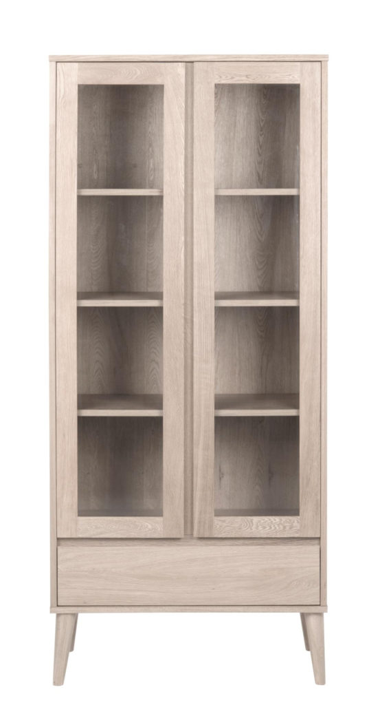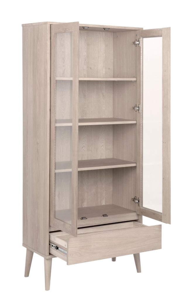 Stijlvolle Nagano vitrinekast met eikenfineer in wit pigment, 2 glazen deuren en metalen onderstel. Afmetingen 80x37x178 cm. Perfect voor het tentoonstellen van je favoriete items.