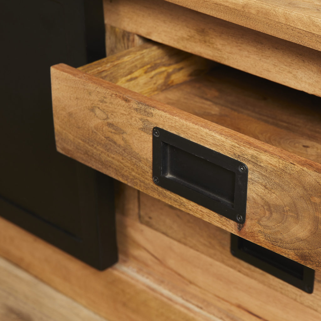 Tv meubel Nashville is uitgevoerd in gelakt mangohout in combinatie met een zwart gelakt metalen deuren. Dit model is voorzien van een deur en vier lades. Deze kast is ingelegd met verschillende stroken hout, waar het meubel zijn eigentijdse karakter aan te danken heeft.