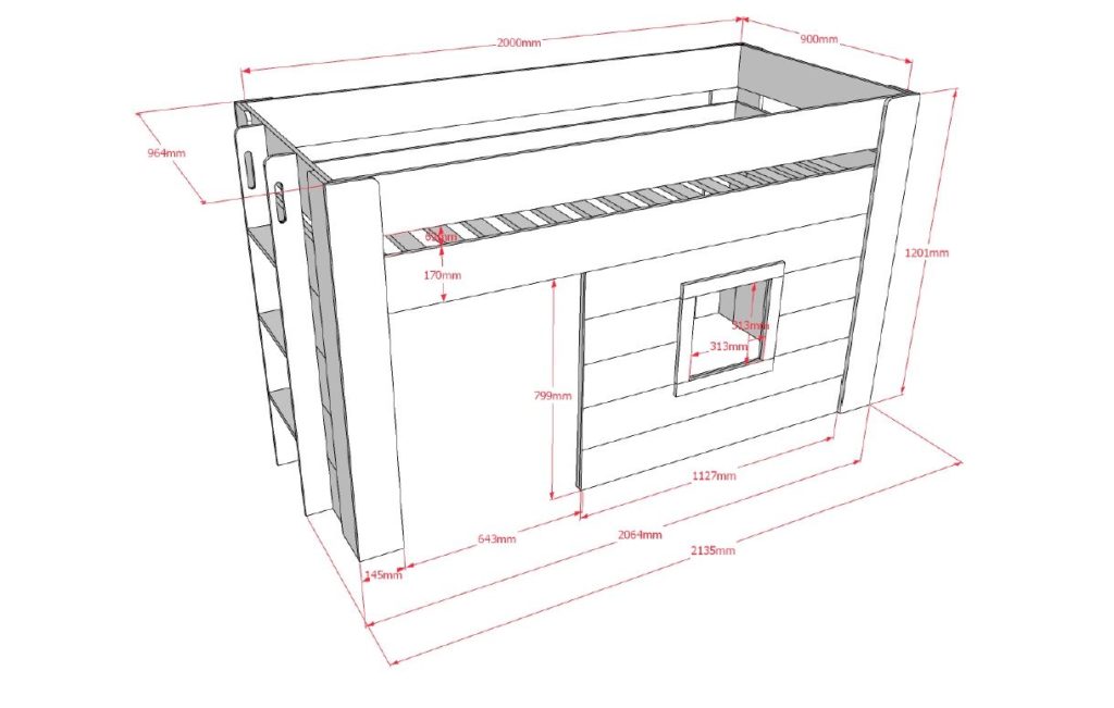 De NOAH hoogslaper is vervaardigd uit wit gelakt MDF. De lattenbodem is inbegrepen. Het slaapgedeelte is voorzien van een volledige omranding als uitvalbeveiliging. Het onderste gedeelte lijkt perfect op een huis waardoor uw kind uren kan spelen onder het bed. De ladder kan zowel links als rechts gemonteerd worden. De klant kan ook zelf kiezen om het venster links of rechts te monteren. Om het huis nog meer af te werken is er een optionele textiel set beschikbaar die gordijntjes bevat voor het venster en de deur.