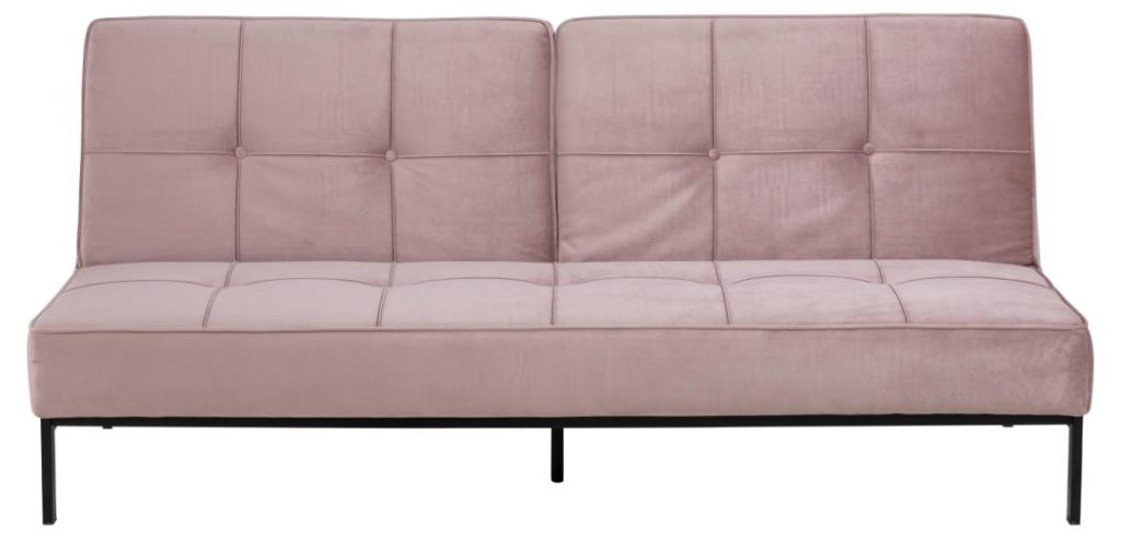 Stijlvol Perugia slaapbank met Vic stof in stoffig roze en zwart, met matzwarte stalen basis en knopen. Eenvoudig om te toveren tot bed, met een moderne uitstraling. Afmetingen: 198x95x87 cm.