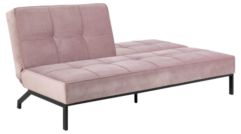 Deze slaapbank is zeer veelzijdig en perfect voor multifunctionele ruimtes, met een modern design dat gemakkelijk transformeert van bank naar ligstoel of bed voor overnachtende gasten. Met een stijlvolle gespleten rug en stoffering in stoffig roze, ideaal voor kleine woonruimtes.