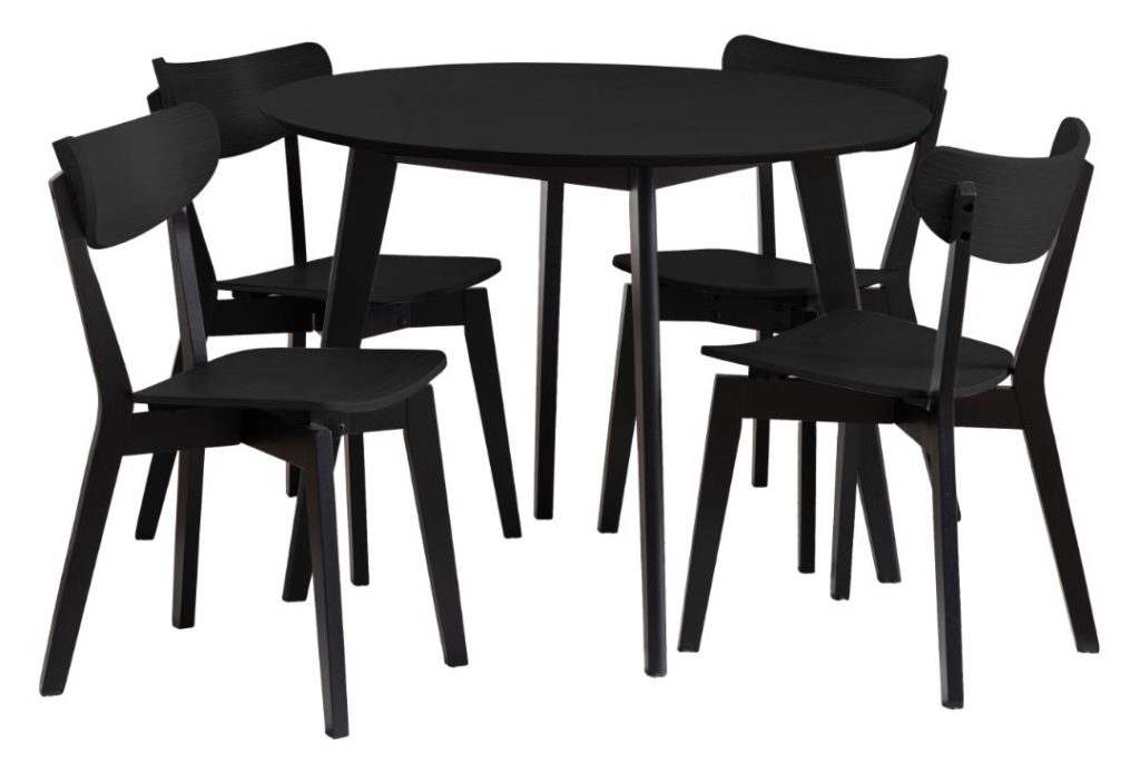Moderniseer je eetruimte met de stijlvolle Roxby ronde tafelset. Met een strakke zwarte eikenfineerblad en stevige rubberhouten basis, inclusief tafel en 4 stoelen. Afmetingen: Ø105x76 cm.