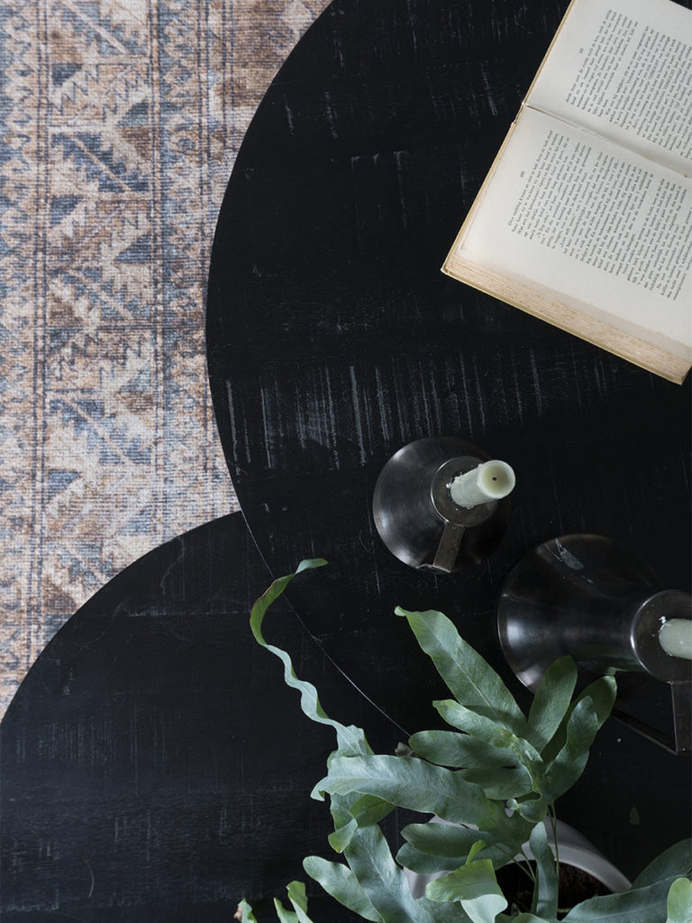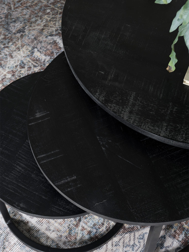 Salontafel Bart is een set van 3 tafels. De combinatie van het zwart metalen frame en zwarte mangohouten blad, geeft deze salontafel een stoere industriële look. De drie salontafels verschillen in hoogte, hierdoor kunnen ze gemakkelijk onder elkaar geschoven worden. Materiaal: Zwart metalen frame met een zwart mangohouten blad (2 cm). Afmetingen: Grote tafel: 76 x 76 x 47 cm.Midden tafel: 56 x 56 x 41 cm.Kleine tafel: 43 x 43 x 34 cm. Onderhoud Mangohout heeft in het algemeen weinig onderhoud nodig en is behandeld tegen vocht en vlekken. Wij geven echter geen garantie op het eventueel ontstaan van oneffenheden. Om beschadigingen, vlekken en kringen te voorkomen, raden wij aan om onderzetters en/of viltjes te gebruiken. Het mangohout is afgewerkt met een laklaag. Om het hout mooi en levendig te houden raden wij aan om het hout 2 tot 4 keer per jaar te behandelen met Elite Polish.