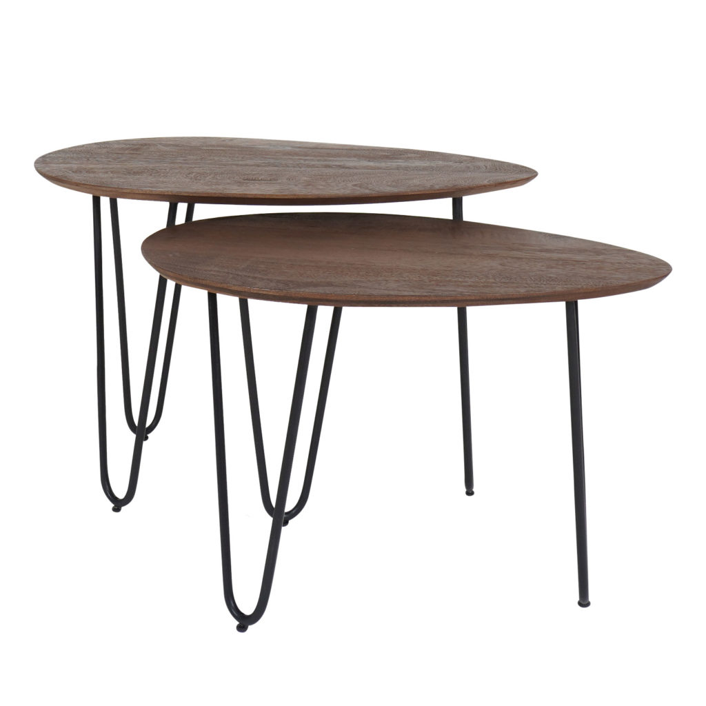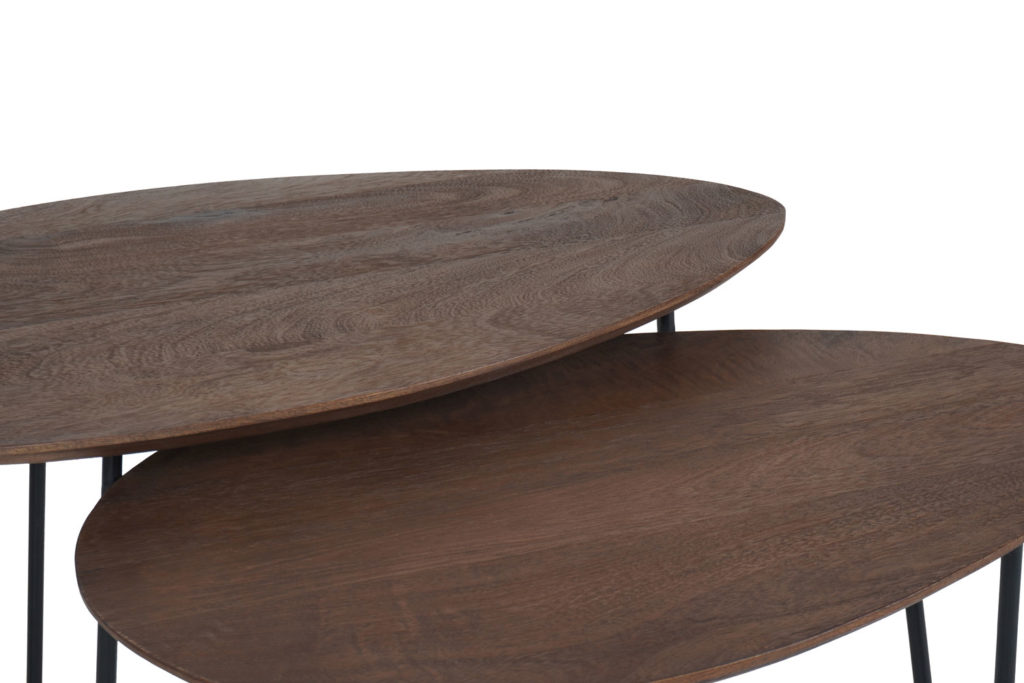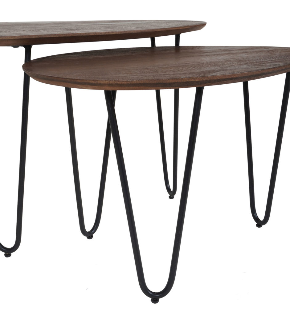 Salontafel Fabio bestaat uit twee tafels, gemaakt van mangohout en zwart metaal. Deze salontafelset is handig in gebruik, omdat de tafels dankzij de schuifruimte naar eigen wens kunnen worden geplaatst. Een echte, speelse must-have! Fabio bestaat uit twee organisch gevormde tafels. Onder de grotere tafel van 68 x 43 x 44 cm schuif je eenvoudig de kleinere tafel van 60 x 42 x 40 cm. Zo bepaal je helemaal zelf hoe je de tafels neerzet. De tafelbladen zijn uitgevoerd in natuurlijk espresso mangohout. De drie speelse hairpin poten in zwart geven de tafels een fris en luchtig karakter. De salontafelset Fabio wordt gedemonteerd geleverd. Onderhoud Mangohout heeft in het algemeen weinig onderhoud nodig en is behandeld tegen vocht en vlekken. Gebruik een lichtvochtige doek om de tafels schoon te maken. Wij geven echter geen garantie op het eventueel ontstaan van oneffenheden. Om beschadigingen, vlekken en kringen te voorkomen, raden wij aan om onderzetters en/of viltjes te gebruiken. Het mangohout is afgewerkt met een beschermlaag. Om het hout te beschermen én mooi en levendig te houden raden wij aan om het hout 2 tot 4 keer per jaar te behandelen met Elite Polish.