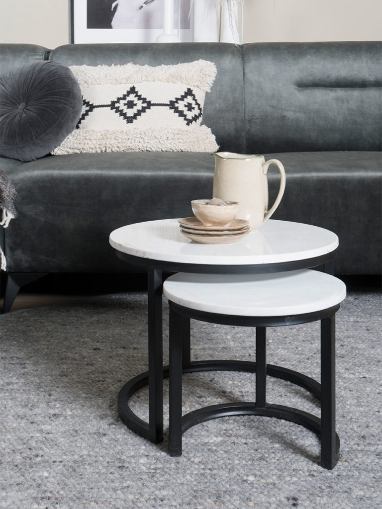 Op zoek naar een luxe en stijlvolle salontafel? Dan is salontafel set Jasmin perfect voor in jouw interieur! Het marmeren blad is 2 cm dik en heeft een mooie glans. De combinatie van het metalen frame en het marmeren tafelblad, geeft deze salontafel een luxe uitstraling. Het materiaal marmer is een zeer sterke steensoort en daarnaast gemakkelijk schoon te houden. Salontafel Jasmin Marmer is een set van 3 tafels. De drie salontafels verschillen in hoogte, hierdoor kunnen ze gemakkelijk onder elkaar geschoven worden. Deze salontafel set wordt gratis thuisbezorgd. Na ontvangst kan je de set direct een mooie plek in huis geven. De tafels zijn namelijk al in elkaar gezet. Mocht de set van 3 na ontvangt toch geen match zijn met jouw interieur, is het uiteraard mogelijk de set te retourneren. Afmetingen:Kleine tafel: 33 x 33 x 30.5 cm.Middel tafel: 47 x 47 x 37 cm.Grote tafel: 61 x 61 x 41.5 cm.