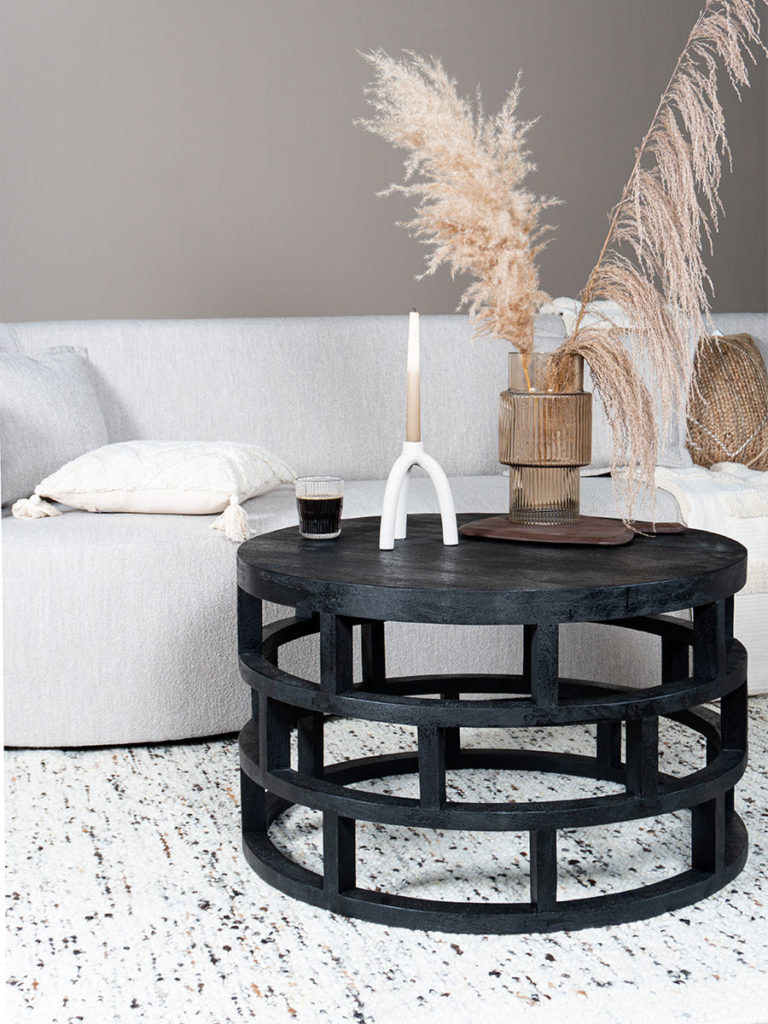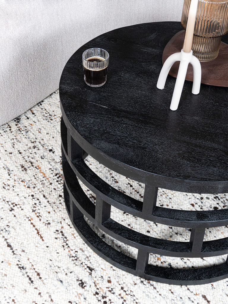 Met zijn unieke constructie, opgebouwd uit ringen, zal Salontafel Jax een echte blikvanger zijn in jouw woonkamer. Het gebruik van zwart mangohout geeft deze salontafel een eigentijdse uitstraling met een vleugje rustieke charme. De diepe zwarte kleur van het hout zorgt voor een stijlvol contrast en past perfect bij verschillende interieurstijlen. Onderhoud Mangohout heeft in het algemeen weinig onderhoud nodig en is behandeld tegen vocht en vlekken. Wij geven echter geen garantie op het eventueel ontstaan van oneffenheden. Om beschadigingen, vlekken en kringen te voorkomen, raden wij aan om onderzetters en/of viltjes te gebruiken. Het mangohout is afgewerkt met een laklaag. Om het hout mooi en levendig te houden raden wij aan om het hout 2 tot 4 keer per jaar te behandelen met Elite Polish.