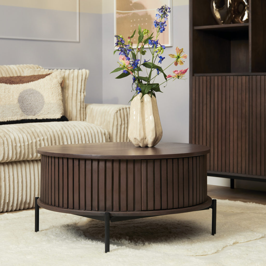 Ronde salontafel Madison Bruin van mangohout (Ø80×H40 cm). Twee ruime lades met verticaal lattenpatroon, warme bruine finish en stevig metalen onderstel. Handgemaakt en uniek — kleine onregelmatigheden geven karakter. Onderhoud: afnemen met een lichtvochtige doek.